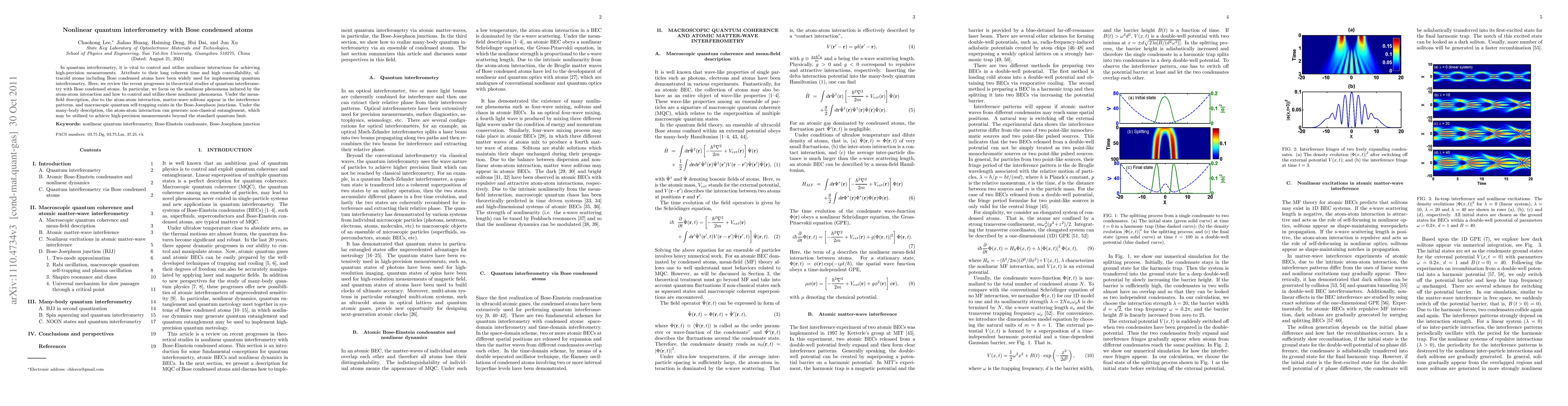 This paper reviews recent theoretical advancements in quantum interferometry using Bose condensed atoms, focusing on nonlinear phenomena like matter-wave solitons and macroscopic quantum self-trapping due to atom-atom interactions, and the potential for high-precision measurements through non-classical entanglement.