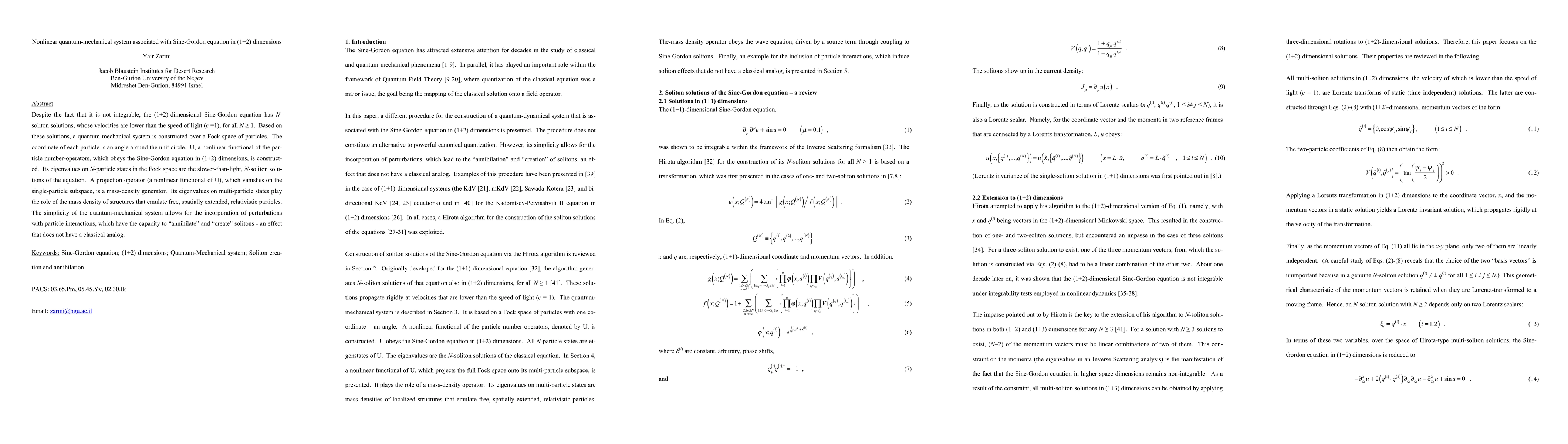 This paper constructs a quantum-mechanical system based on the nonlinear 1+2-dimensional Sine-Gordon equation, revealing N-soliton solutions with subluminal velocities. It introduces a mass-density generator and explores soliton interactions that can create and annihilate solitons, a phenomenon absent in classical systems.