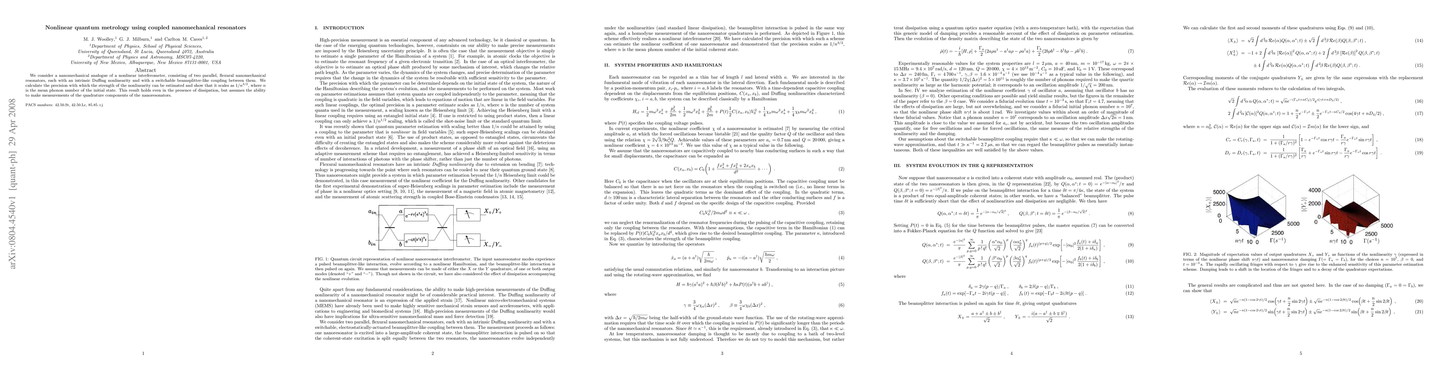 This paper investigates a nonlinear quantum metrology setup using coupled nanomechanical resonators with intrinsic Duffing nonlinearity, demonstrating that the estimation precision of the nonlinearity strength scales as $1/n^{3/2}$, even with dissipation, provided measurements of quadrature components are feasible.