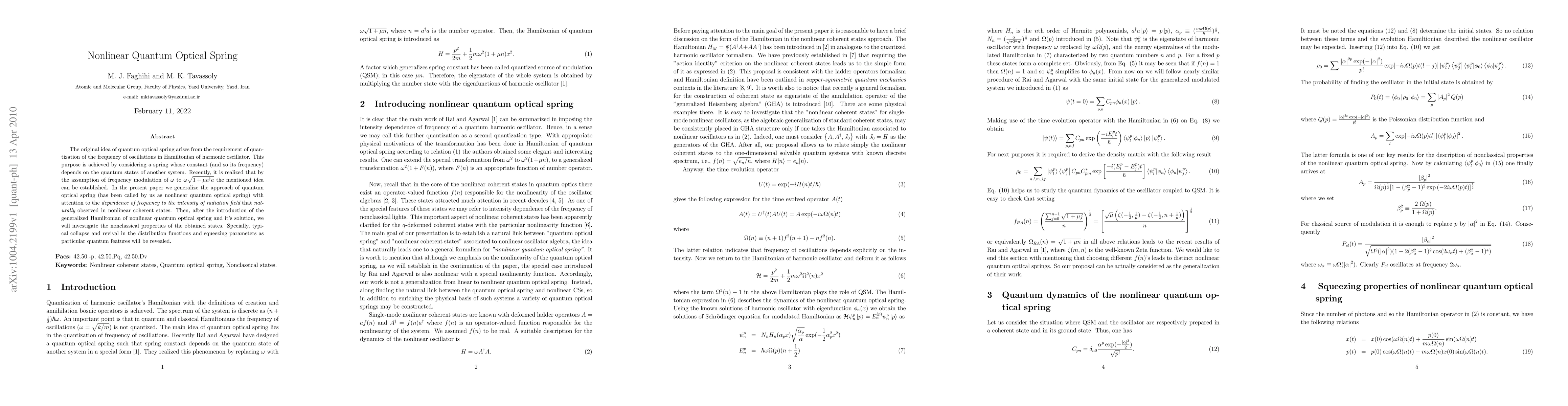 The original idea of quantum optical spring arises from the requirement of quantization of the frequency of oscillations in Hamiltonian of harmonic oscillator. This purpose is achieved by considering a spring whose constant (and so its frequency) depends on the quantum states of another system. Recently, it is realized that by the assumption of frequency modulation of $\omega$ to $\omega\sqrt{1+\mu a^\dagger a}$ the mentioned idea can be established. In the present paper we generalize the approach of quantum optical spring (has been called by us as nonlinear quantum optical spring) with attention to the {\it dependence of frequency to the intensity of radiation field} that {\it naturally} observed in nonlinear coherent states. Then, after the introduction of the generalized Hamiltonian of nonlinear quantum optical spring and it's solution, we will investigate the nonclassical properties of the obtained states. Specially, typical collapse and revival in the distribution functions and squeezing parameters as particular quantum features will be revealed.