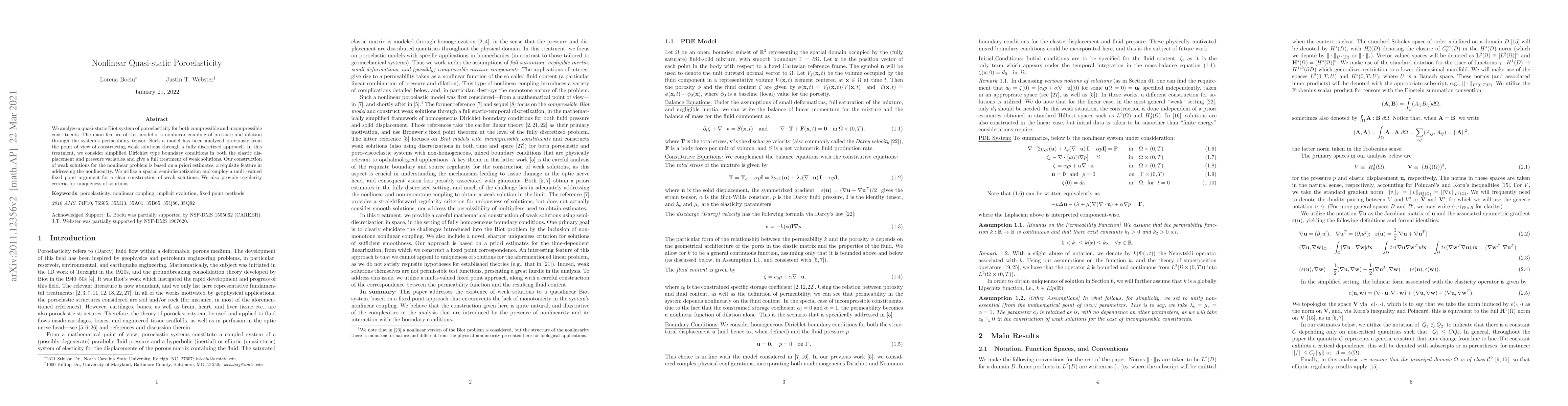 This paper investigates quasi-static poroelasticity models for both compressible and incompressible materials, focusing on nonlinear coupling between pressure and dilation via the permeability tensor. The authors construct weak solutions using a spatial semi-discretization and a multi-valued fixed point argument, providing a priori estimates and regularity criteria for solution uniqueness.