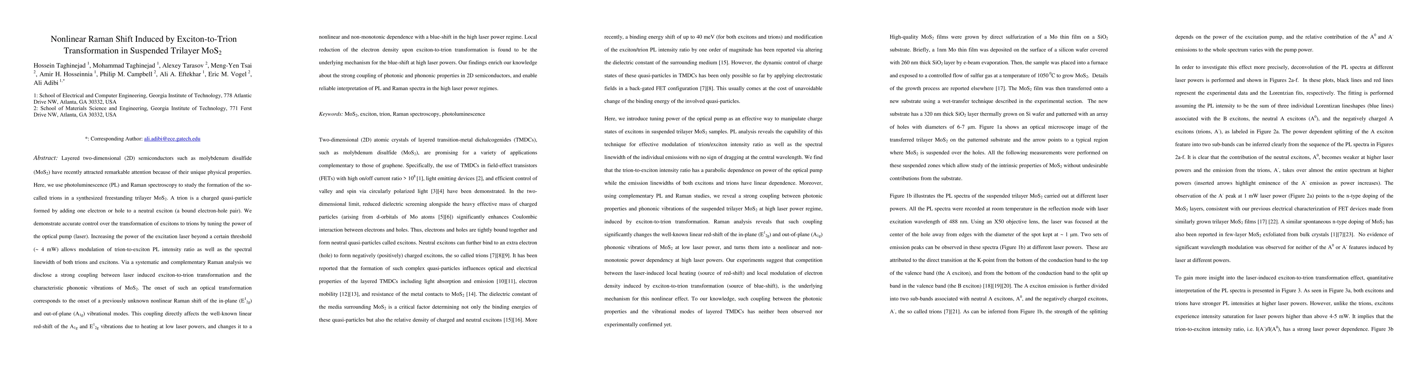 Layered two-dimensional (2D) semiconductors such as molybdenum disulfide (MoS2) have recently attracted remarkable attention because of their unique physical properties. Here, we use photoluminescence (PL) and Raman spectroscopy to study the formation of the so- called trions in a synthesized freestanding trilayer MoS2. A trion is a charged quasi-particle formed by adding one electron or hole to a neutral exciton (a bound electron-hole pair). We demonstrate accurate control over the transformation of excitons to trions by tuning the power of the optical pump (laser). Increasing the power of the excitation laser beyond a certain threshold (~ 4 mW) allows modulation of trion-to-exciton PL intensity ratio as well as the spectral linewidth of both trions and excitons. Via a systematic and complementary Raman analysis we disclose a strong coupling between laser induced exciton-to-trion transformation and the characteristic phononic vibrations of MoS2. The onset of such an optical transformation corresponds to the onset of a previously unknown nonlinear Raman shift of the in-plane (E12g) and out-of-plane (A1g) vibrational modes. This coupling directly affects the well-known linear red-shift of the A1g and E12g vibrations due to heating at low laser powers, and changes it to a nonlinear and non-monotonic dependence with a blue-shift in the high laser power regime. Local reduction of the electron density upon exciton-to-trion transformation is found to be the underlying mechanism for the blue-shift at high laser powers. Our findings enrich our knowledge about the strong coupling of photonic and phononic properties in 2D semiconductors, and enable reliable interpretation of PL and Raman spectra in the high laser power regimes.