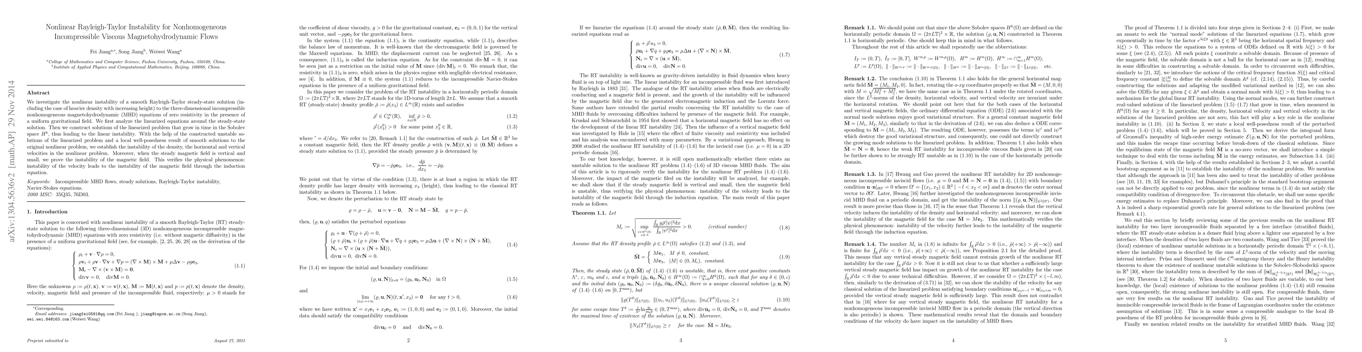This paper investigates the nonlinear Rayleigh-Taylor instability in nonhomogeneous incompressible viscous magnetohydrodynamic flows under a uniform gravitational field. It establishes the instability of density, velocities, and magnetic field through analysis of linearized equations and construction of unstable solutions.