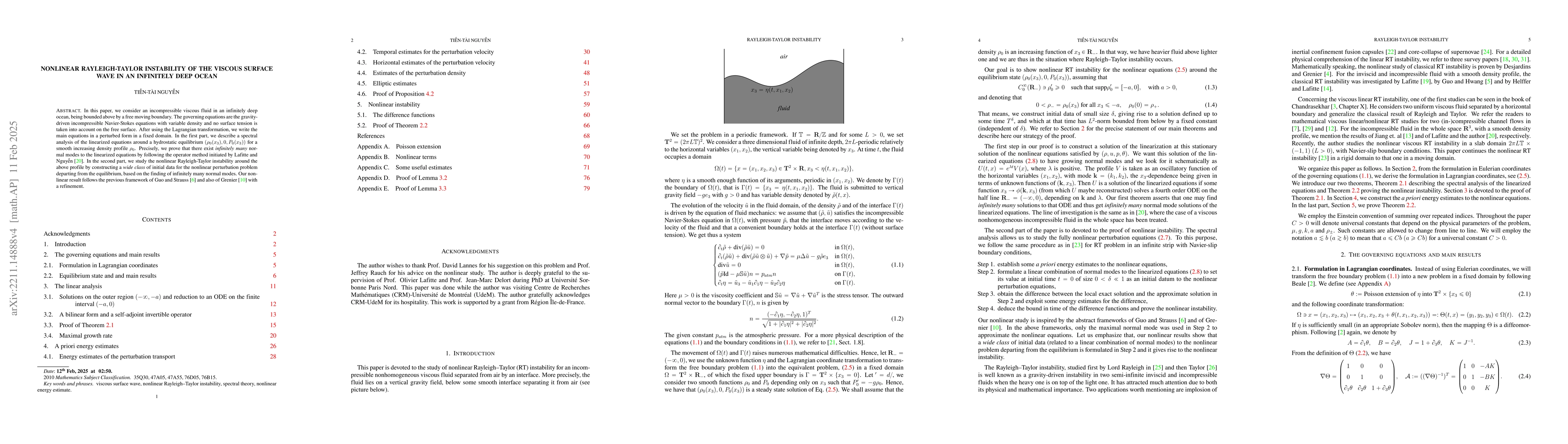 In this paper, we consider an incompressible viscous fluid in an infinitely deep ocean, being bounded above by a free moving boundary. The governing equations are the gravity-driven incompressible Navier-Stokes equations with variable density and no surface tension is taken into account on the free surface. After using the Lagrangian transformation, we write the main equations in a perturbed form in a fixed domain. In the first part, we describe a spectral analysis of the linearized equations around a hydrostatic equilibrium $(\rho_0(x_3), 0, P_0(x_3))$ for a smooth increasing density profile $\rho_0$. Precisely, we prove that there exist multiple normal modes to the linearized equations by following the operator method initiated by Lafitte and Nguyen \cite{LN20}. In the second part, we study the nonlinear Rayleigh-Taylor instability around the above profile by constructing a wide class of initial data for the nonlinear perturbation problem departing from the equilibrium, based on the finding of multiple normal modes. Our nonlinear result follows the previous framework of Guo and Strauss \cite{GS95} and also of Grenier \cite{Gre00} with a refinement.