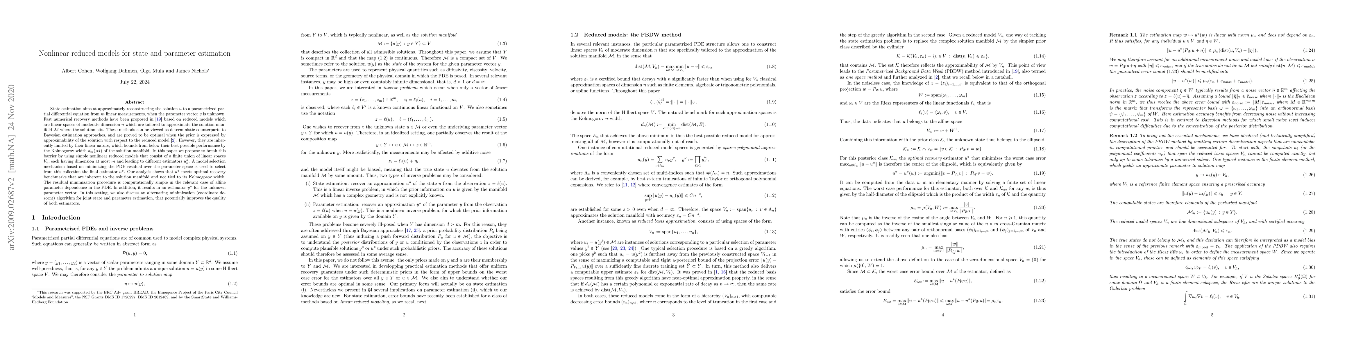 This paper proposes nonlinear reduced models to enhance state and parameter estimation for parametrized partial differential equations, overcoming the limitations of linear reduced models. It uses a collection of linear spaces to select the optimal estimator based on minimizing the PDE residual, achieving optimal recovery benchmarks independent of the solution manifold's Kolmogorov width.