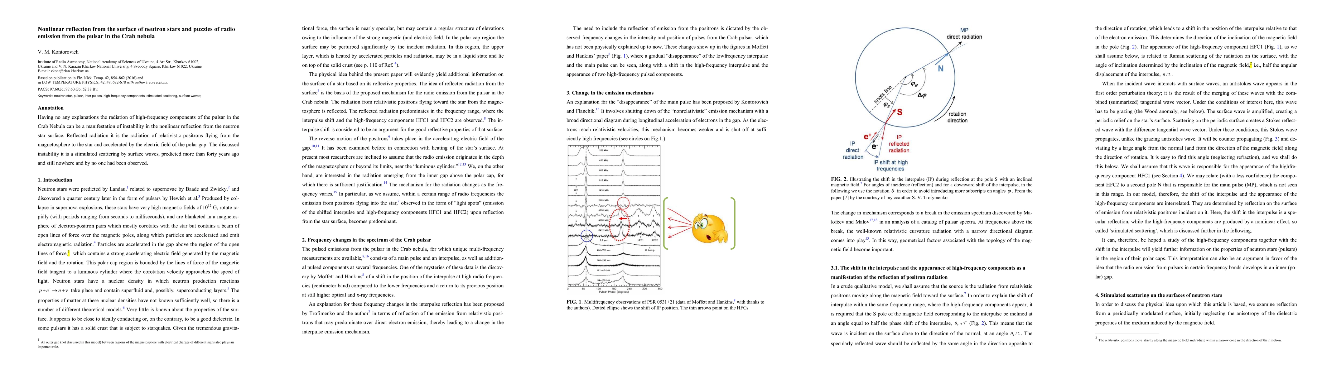 This paper explores the potential of nonlinear reflection from the surface of neutron stars to explain the high-frequency radio emission from the Crab Nebula pulsar, suggesting that this radiation could be due to instability in stimulated scattering by surface waves, a phenomenon predicted decades ago but never observed.