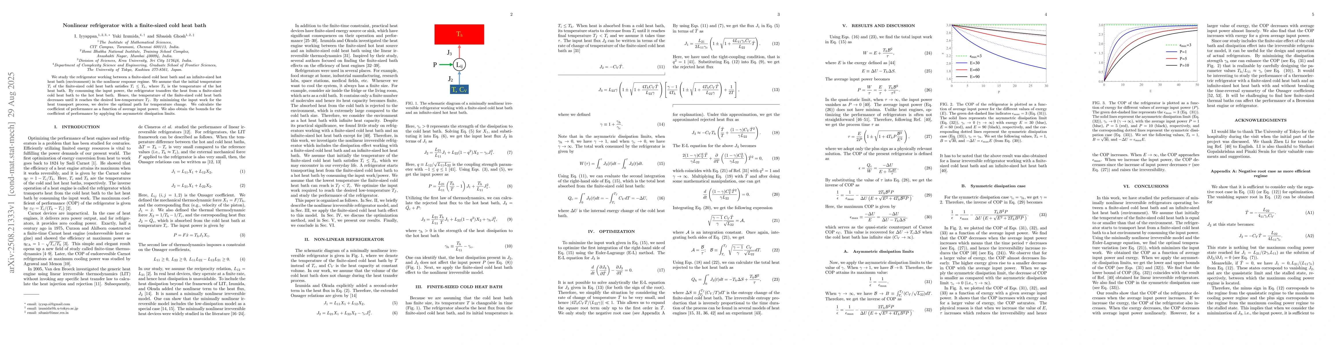We study the refrigerator working between a finite-sized cold heat bath and an infinite-sized hot heat bath (environment) in the nonlinear response regime. We assume that the initial temperature $T_i$ of the finite-sized cold heat bath satisfies $T_i\leq T_h$, where $T_h$ is the temperature of the hot heat bath. By consuming the input power, the refrigerator transfers the heat from a finite-sized cold heat bath to the hot heat bath. Hence, the temperature of the finite-sized cold heat bath decreases until it reaches the desired low-temperature $T_f$. By minimizing the input work for the heat transport process, we derive the optimal path for temperature change. We calculate the coefficient of performance as a function of average input power. We also obtain the bounds for the coefficient of performance by applying the asymmetric dissipation limits.