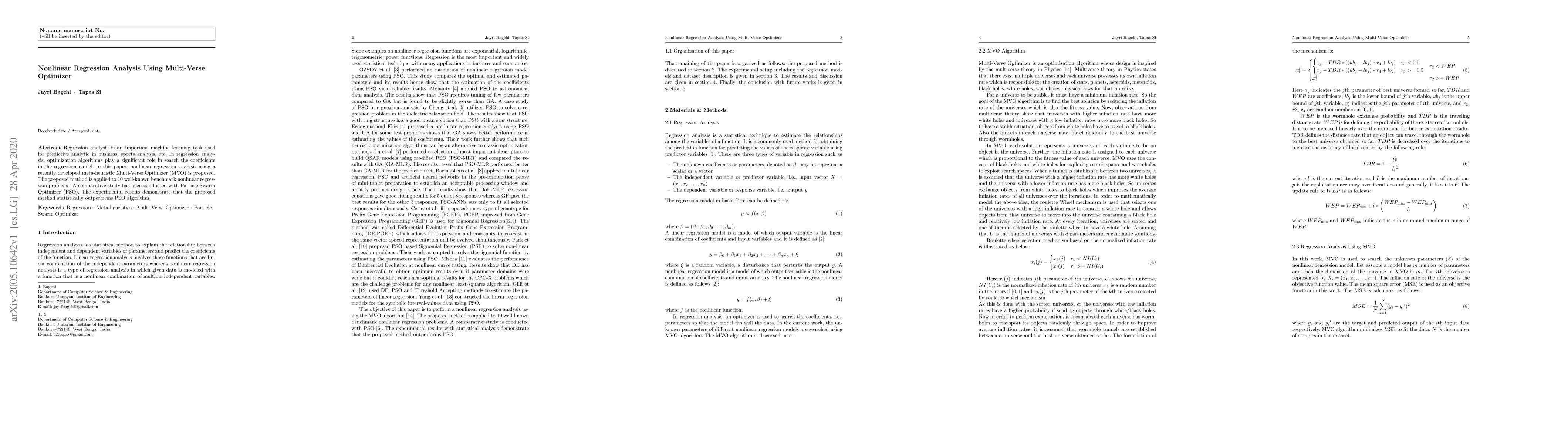 This paper proposes a nonlinear regression analysis using the Multi-Verse Optimizer (MVO) meta-heuristic algorithm, demonstrating its effectiveness through a comparative study against the Particle Swarm Optimizer (PSO) on 10 benchmark problems, showing statistically superior performance.