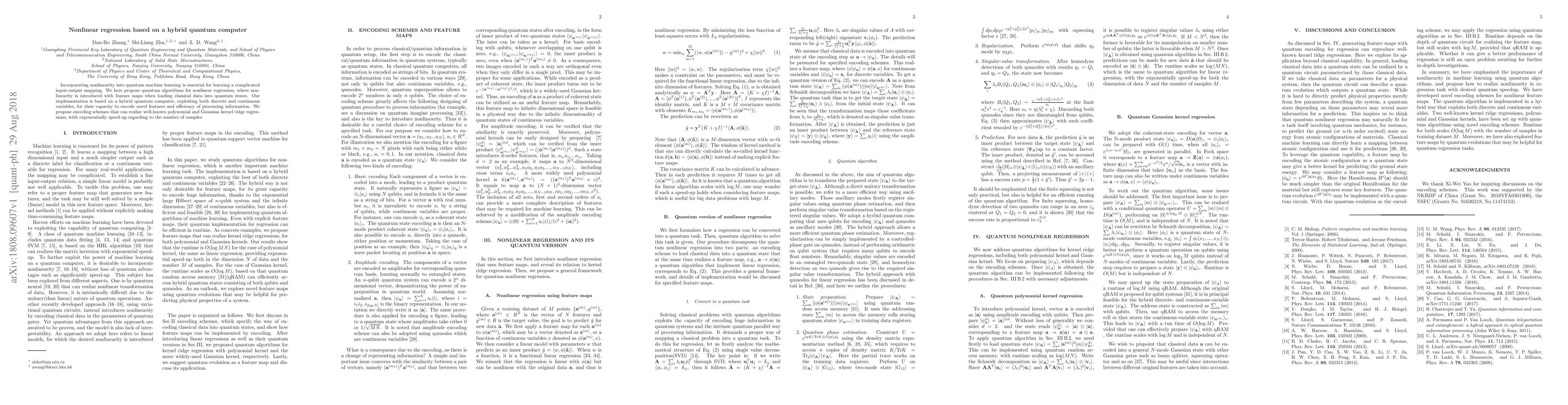 This paper proposes quantum algorithms for nonlinear regression using hybrid quantum computers, introducing nonlinearity via feature maps to handle complex input-output mappings. The approach leverages both discrete and continuous variables for feature encoding and information processing, achieving exponential speed-up over classical methods.