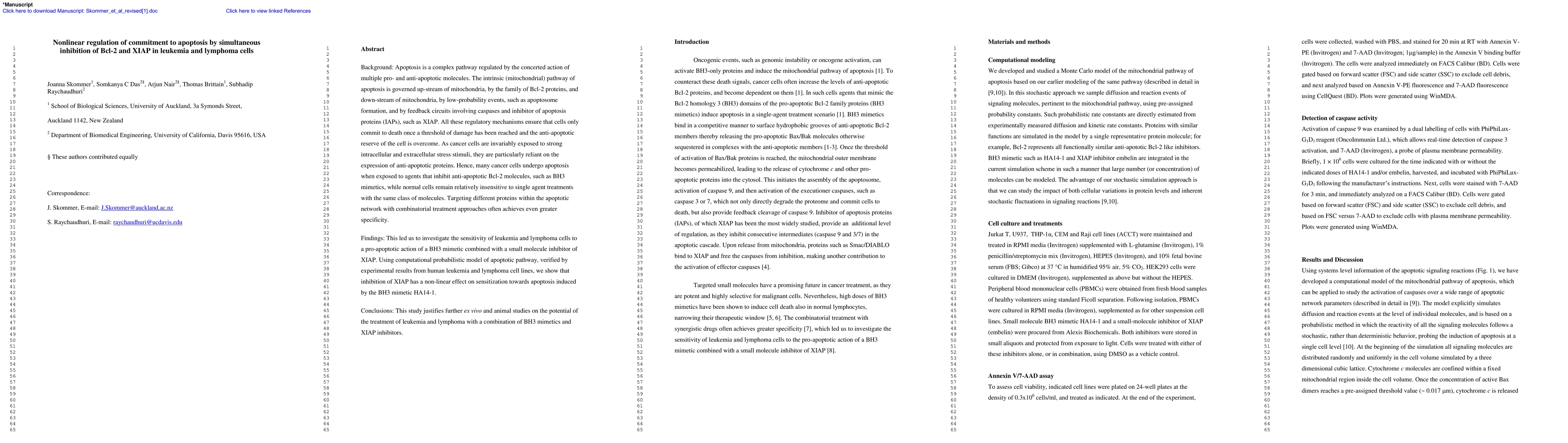 This study investigates the nonlinear regulation of apoptosis in leukemia and lymphoma cells through simultaneous inhibition of Bcl-2 and XIAP, demonstrating that combinatorial treatment with a BH3 mimetic and a XIAP inhibitor significantly enhances pro-apoptotic effects compared to single-agent treatments. The findings suggest potential for effective leukemia and lymphoma therapies using this dual-inhibition approach.