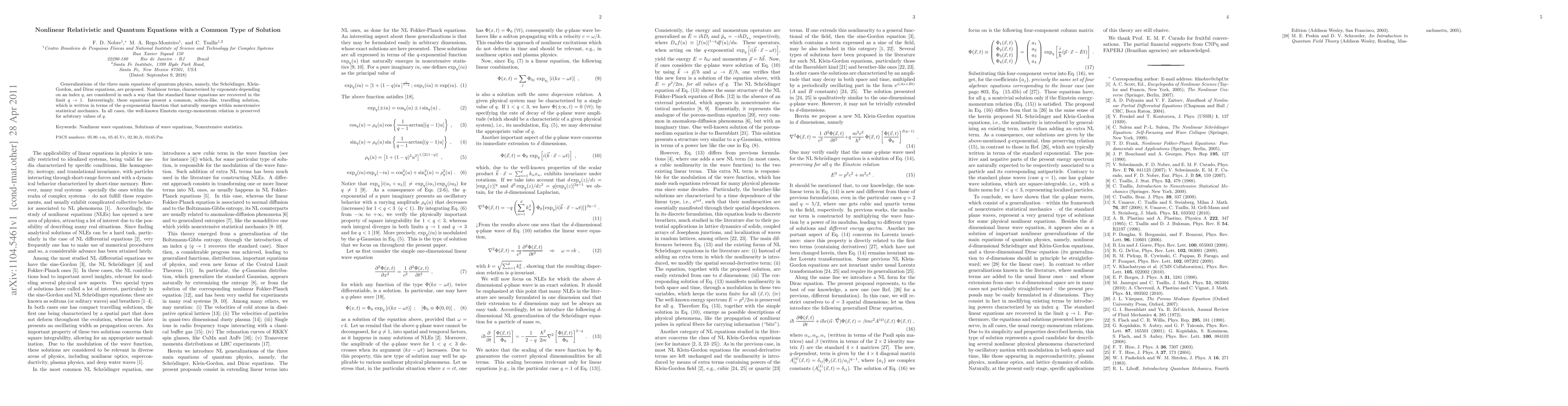 Generalizations of the three main equations of quantum physics, namely, the Schr\"odinger, Klein-Gordon, and Dirac equations, are proposed. Nonlinear terms, characterized by exponents depending on an index $q$, are considered in such a way that the standard linear equations are recovered in the limit $q \rightarrow 1$. Interestingly, these equations present a common, soliton-like, travelling solution, which is written in terms of the $q$-exponential function that naturally emerges within nonextensive statistical mechanics. In all cases, the well-known Einstein energy-momentum relation is preserved for arbitrary values of $q$.