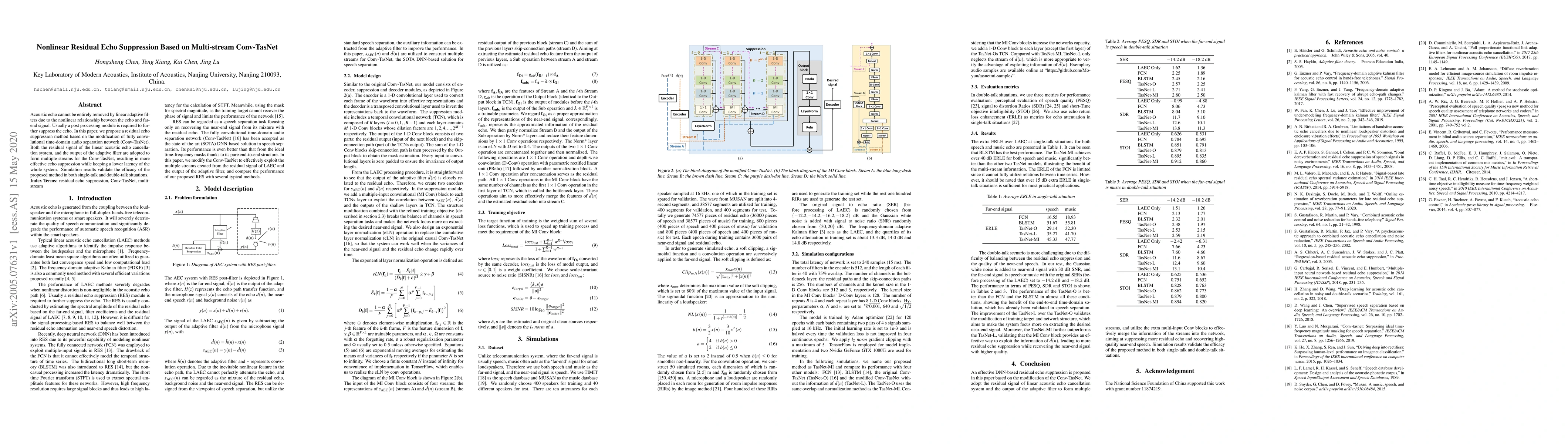 This paper proposes a nonlinear residual echo suppression method using a modified Conv-TasNet that processes multiple streams, including the residual signal from a linear echo cancellation system and the adaptive filter output, achieving effective echo suppression with lower latency. Simulation results show its efficacy in single-talk and double-talk scenarios.