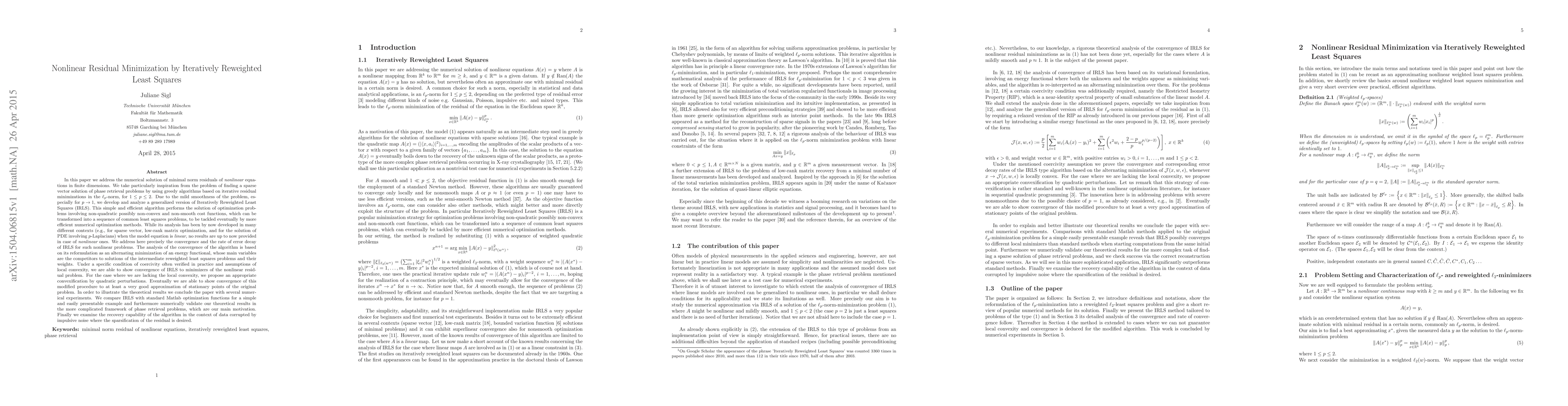 This paper develops a generalized Iteratively Reweighted Least Squares (IRLS) algorithm for solving nonlinear residual minimization problems. It analyzes convergence and error decay rates, showing that under specific conditions, IRLS converges to minimizers of the nonlinear problem, and proposes convexification when local convexity is lacking. The method is validated through numerical experiments comparing it with standard Matlab functions and in complex phase retrieval problems.