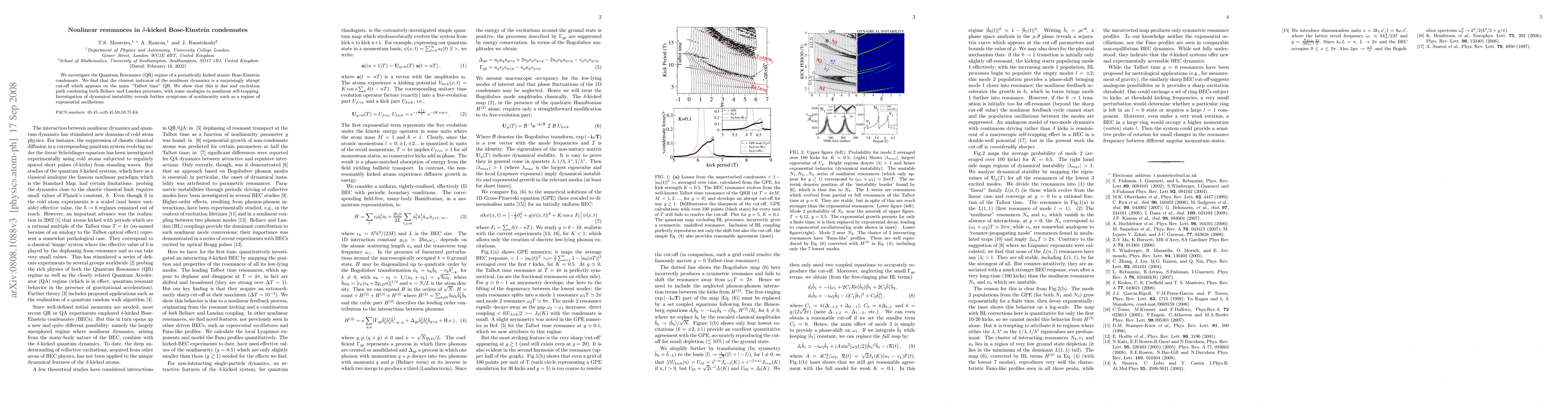 We investigate the Quantum Resonance (QR) regime of a periodically kicked atomic Bose-Einstein condensate. We find that the clearest indicator of the nonlinear dynamics is a surprisingly abrupt cut-off which appears on the main "Talbot time" QR. We show that this is due and excitation path combining both Beliaev and Landau processes, with some analogies to nonlinear self-trapping. Investigation of dynamical instability reveals further symptoms of nonlinearity such as a regime of exponential oscillations.