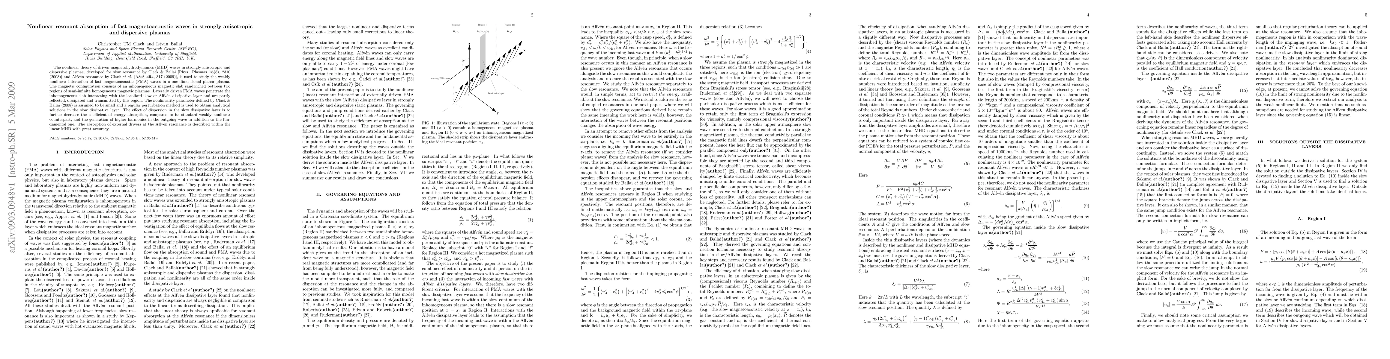 This paper develops a nonlinear theory for the interaction of fast magnetoacoustic waves in strongly anisotropic and dispersive plasmas, focusing on weakly nonlinear absorption in a magnetic slab. Analytical solutions reveal that dispersion reduces energy absorption and generates higher harmonics, with accurate linear MHD descriptions of Alfvén resonance absorption.