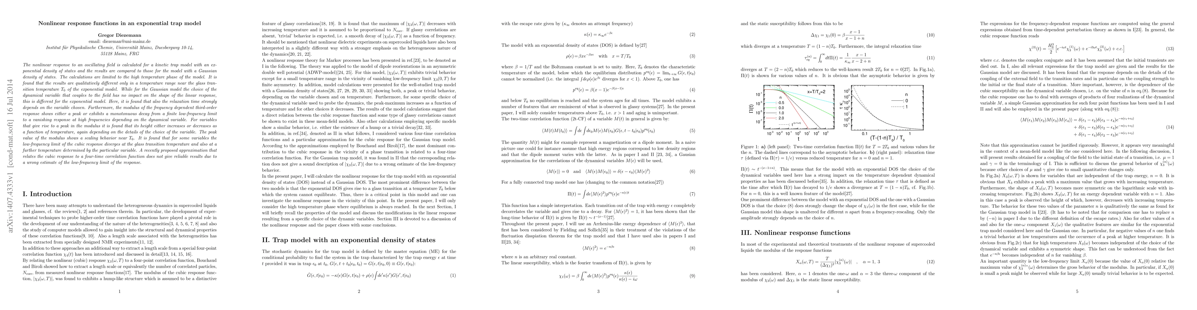 This research compares nonlinear responses of an exponential and a Gaussian trap model to oscillating fields at high temperatures. It reveals that the choice of dynamical variable significantly impacts the exponential model's response shape and relaxation time, particularly near the glass transition temperature ($T_0$). The study finds that the cubic response's modulus either peaks or decays, with its characteristics influenced by the chosen variable and displaying scaling behavior near $T_0$. Some variables cause a divergent low-frequency limit of the cubic response at $T_0$ and another temperature dependent on the variable. The approximation relating cubic response to a four-time correlation function is deemed unreliable due to inaccurate low-frequency limit estimation.