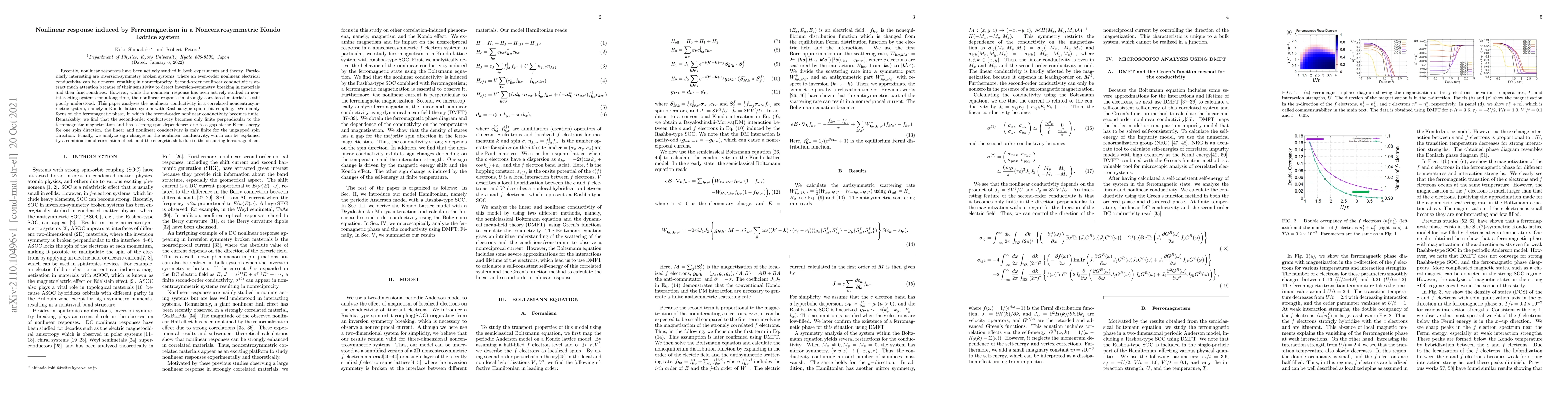 Recently, nonlinear responses have been actively studied in both experiments and theory. Particularly interesting are inversion-symmetry broken systems, where an even-order nonlinear electrical conductivity can be nonzero, resulting in nonreciprocity. Second-order nonlinear conductivities attract much attention because of their sensitivity to detect inversion-symmetry breaking in materials and their functionalities. However, while the nonlinear response has been actively studied in noninteracting systems for a long time, the nonlinear response in strongly correlated materials is still poorly understood. This paper analyzes the nonlinear conductivity in a correlated noncentrosymmetric system, namely a Kondo lattice system with Rashba type spin-orbit coupling. We mainly focus on the ferromagnetic phase, in which the second-order nonlinear conductivity becomes finite. Remarkably, we find that the second-order conductivity becomes only finite perpendicular to the ferromagnetic magnetization and has a strong spin dependence; due to a gap at the Fermi energy for one spin direction, the linear and nonlinear conductivity is only finite for the ungapped spin direction. Finally, we analyze sign changes in the nonlinear conductivity, which can be explained by a combination of correlation effects and the energetic shift due to the occurring ferromagnetism.