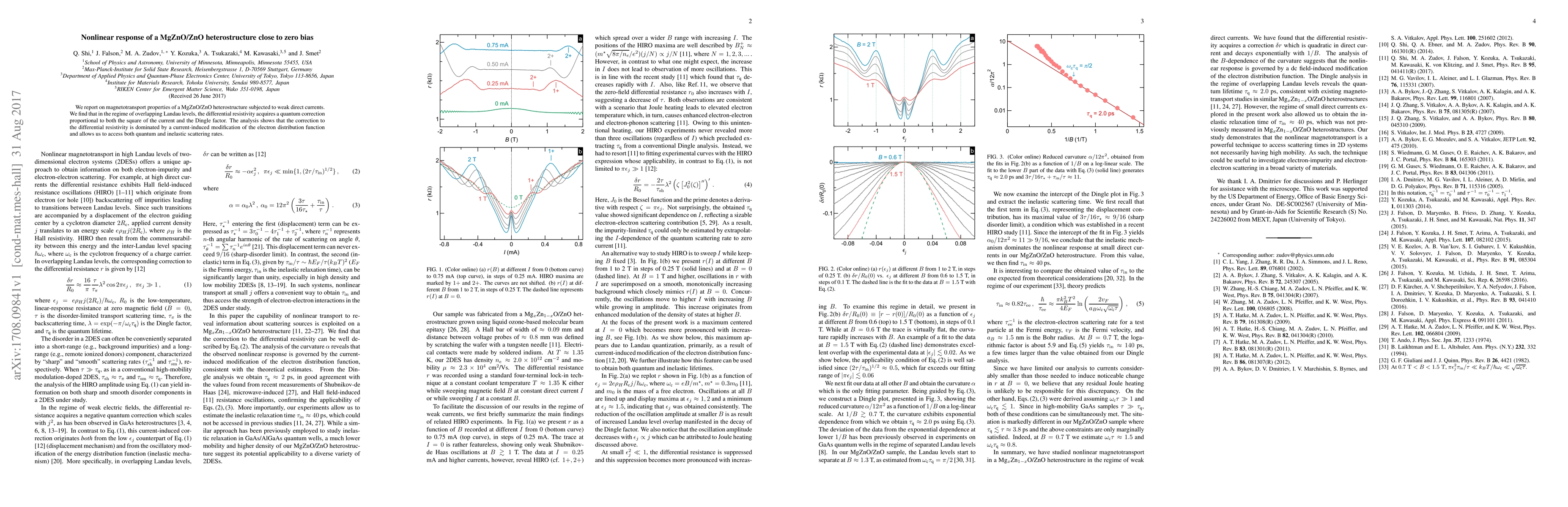 We report on magnetotransport properties of a MgZnO/ZnO heterostructure subjected to weak direct currents. We find that in the regime of overlapping Landau levels, the differential resistivity acquires a quantum correction proportional to both the square of the current and the Dingle factor. The analysis shows that the correction to the differential resistivity is dominated by a current-induced modification of the electron distribution function and allows us to access both quantum and inelastic scattering rates.