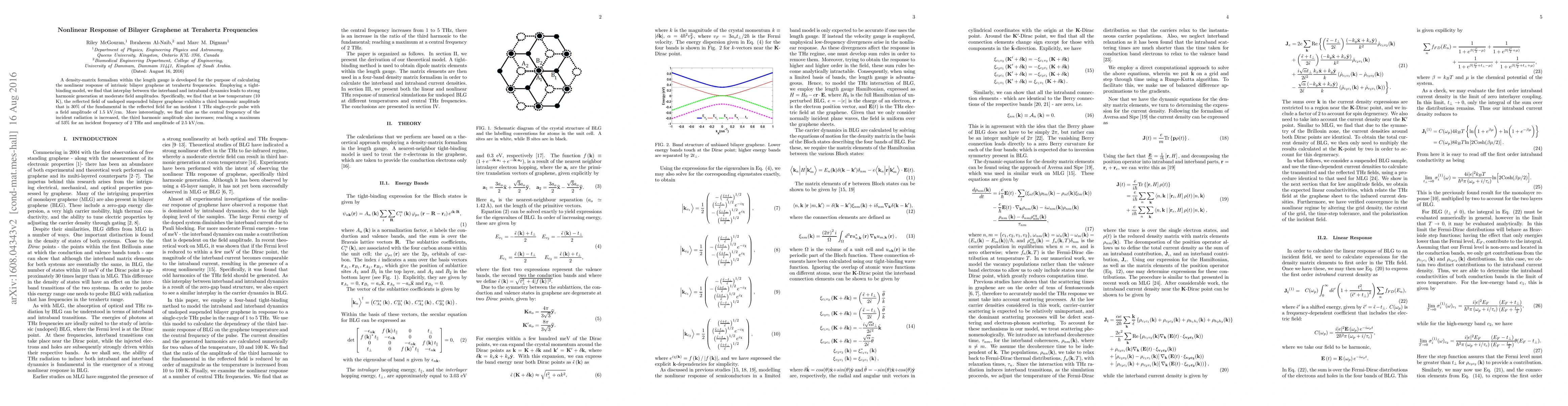 This study employs a density-matrix formalism to investigate the nonlinear response of intrinsic bilayer graphene at terahertz frequencies, revealing strong harmonic generation due to interband and intraband dynamics. The reflected field of undoped suspended bilayer graphene shows a third harmonic amplitude of 30% at 1 THz, increasing to 53% at 2 THz with rising incident frequency.