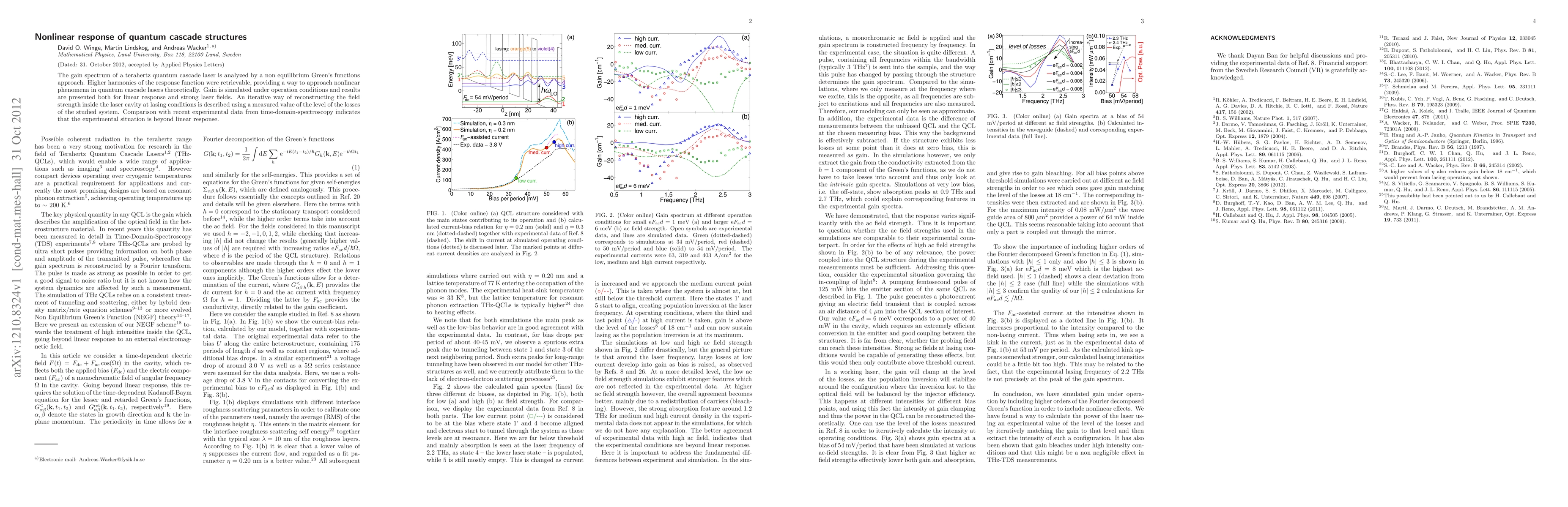 This paper analyzes the gain spectrum of terahertz quantum cascade lasers using non-equilibrium Green's functions, revealing higher harmonics and enabling theoretical study of nonlinear phenomena. Simulation results show gain under both linear and strong field conditions, with an iterative method for reconstructing laser cavity field strength validated against experimental data indicating nonlinear behavior.