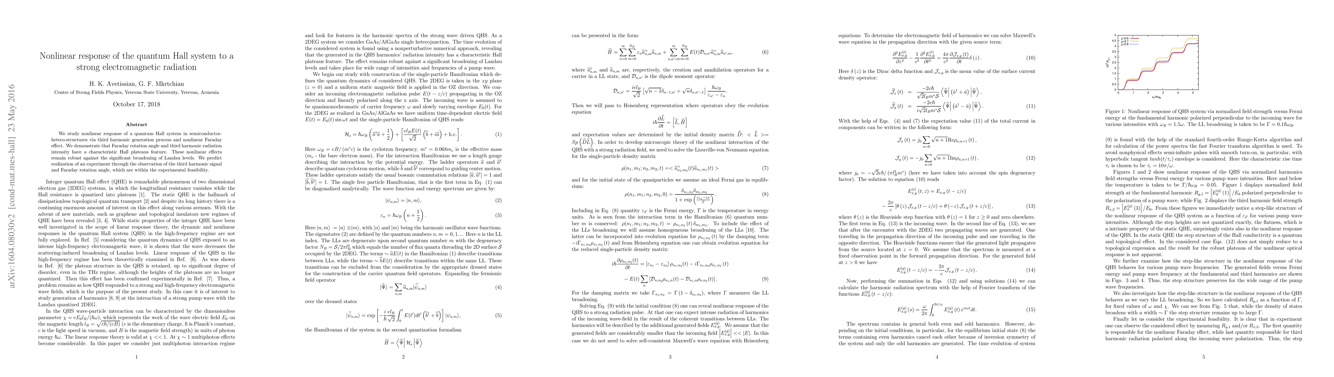This paper investigates the nonlinear response of quantum Hall systems in semiconductor heterostructures, focusing on third harmonic generation and the nonlinear Faraday effect. It reveals that these effects exhibit characteristic Hall plateaus and remain stable despite Landau level broadening, suggesting feasible experimental observation.
