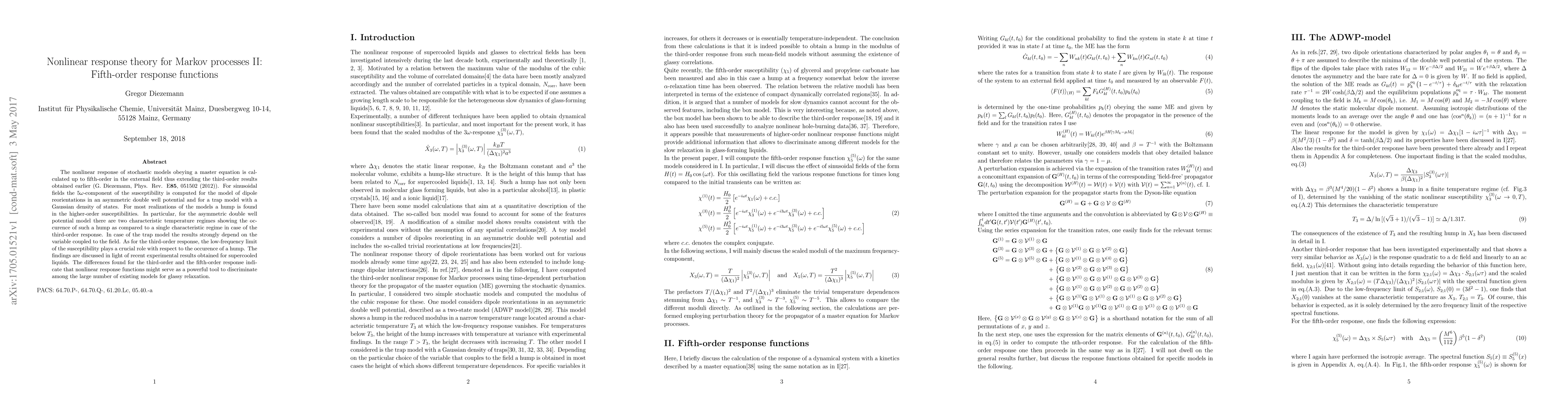The nonlinear response of stochastic models obeying a master equation is calculated up to fifth-order in the external field thus extending the third-order results obtained earlier (G. Diezemann, Phys. Rev. E{\bf 85}, 051502 (2012)). For sinusoidal fields the $5\om$-component of the susceptibility is computed for the model of dipole reorientations in an asymmetric double well potential and for a trap model with a Gaussian density of states. For most realizations of the models a hump is found in the higher-order susceptibilities. In particular, for the asymmetric double well potential model there are two characteristic temperature regimes showing the occurence of such a hump as compared to a single characteristic regime in case of the third-order response. In case of the trap model the results strongly depend on the variable coupled to the field. As for the third-order response, the low-frequency limit of the susceptibility plays a crucial role with respect to the occurence of a hump. The findings are discussed in light of recent experimental results obtained for supercooled liquids. The differences found for the third-order and the fifth-order response indicate that nonlinear response functions might serve as a powerful tool to discriminate among the large number of existing models for glassy relaxation.