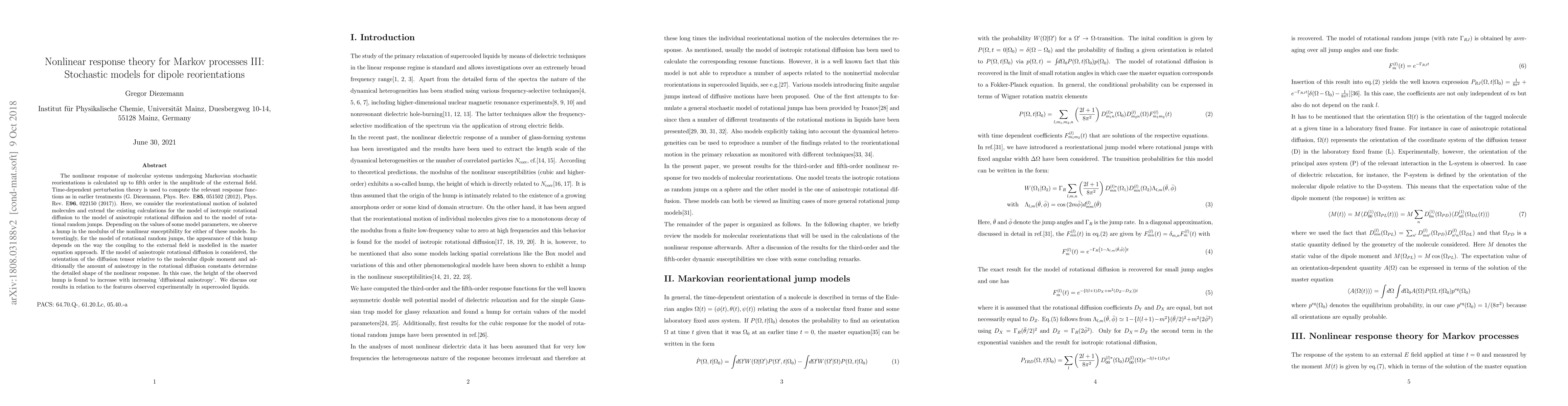 The nonlinear response of molecular systems undergoing Markovian stochastic reorientations is calculated up to fifth order in the amplitude of the external field. Time-dependent perturbation theory is used to compute the relevant response functions as in earlier treatments (G. Diezemann, Phys. Rev. E{\bf 85}, 051502 (2012), Phys. Rev. E{\bf 96}, 022150 (2017)). Here, we consider the reorientational motion of isolated molecules and extend the existing calculations for the model of isotropic rotational diffusion to the model of anisotropic rotational diffusion and to the model of rotational random jumps. Depending on the values of some model parameters, we observe a hump in the modulus of the nonlinear susceptibility for either of these models. Interestingly, for the model of rotational random jumps, the appearance of this hump depends on the way the coupling to the external field is modelled in the master equation approach. If the model of anisotropic rotational diffusion is considered, the orientation of the diffusion tensor relative to the molecular dipole moment and additionally the amount of anisotropy in the rotational diffusion constants determine the detailed shape of the nonlinear response. In this case, the height of the observed hump is found to increase with increasing 'diffusional anisotropy'. We discuss our results in relation to the features observed experimentally in supercooled liquids.
