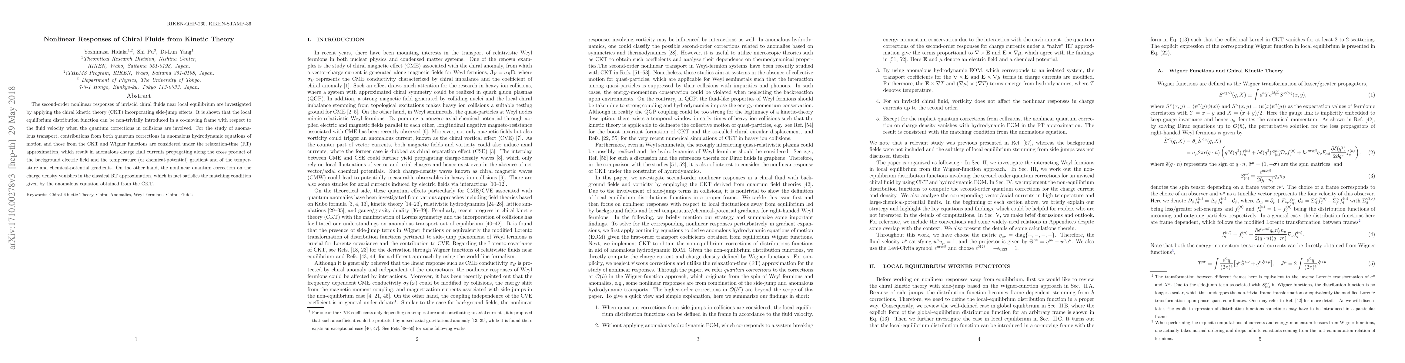 The second-order nonlinear responses of inviscid chiral fluids near local equilibrium are investigated by applying the chiral kinetic theory (CKT) incorporating side-jump effects. It is shown that the local equilibrium distribution function can be non-trivially introduced in a co-moving frame with respect to the fluid velocity when the quantum corrections in collisions are involved. For the study of anomalous transport, contributions from both quantum corrections in anomalous hydrodynamic equations of motion and those from the CKT and Wigner functions are considered under the relaxation-time (RT) approximation, which result in anomalous charge Hall currents propagating along the cross product of the background electric field and the temperature (or chemical-potential) gradient and of the temperature and chemical-potential gradients. On the other hand, the nonlinear quantum correction on the charge density vanishes in the classical RT approximation, which in fact satisfies the matching condition given by the anomalous equation obtained from the CKT.