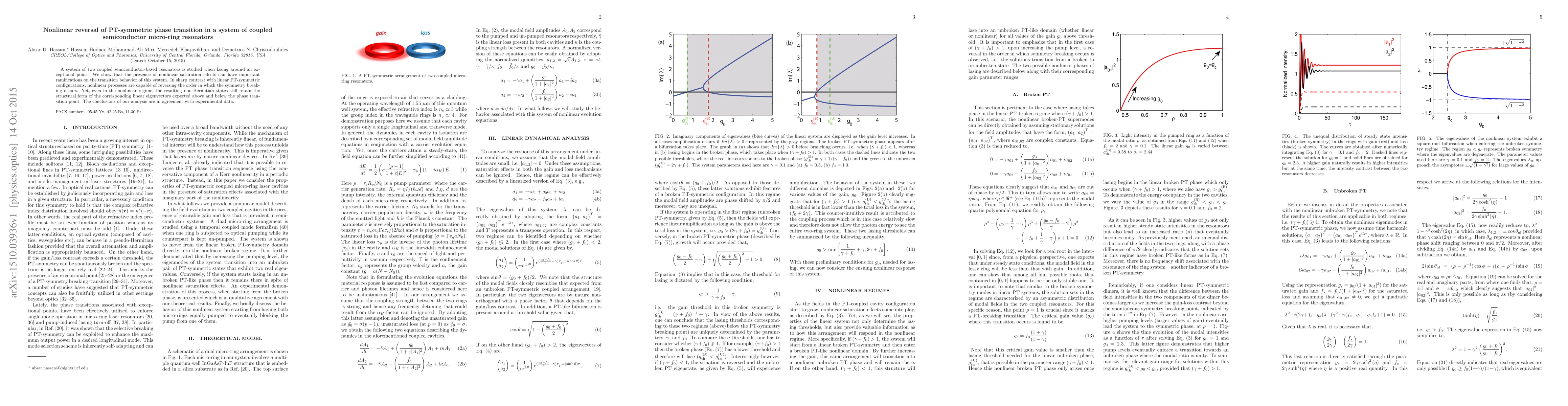 A system of two coupled semiconductor-based resonators is studied when lasing around an exceptional point. We show that the presence of nonlinear saturation effects can have important ramifications on the transition behavior of this system. In sharp contrast with linear PT-symmetric configurations, nonlinear processes are capable of reversing the order in which the symmetry breaking occurs. Yet, even in the nonlinear regime, the resulting non-Hermitian states still retain the structural form of the corresponding linear eigenvectors expected above and below the phase transition point. The conclusions of our analysis are in agreement with experimental data.
