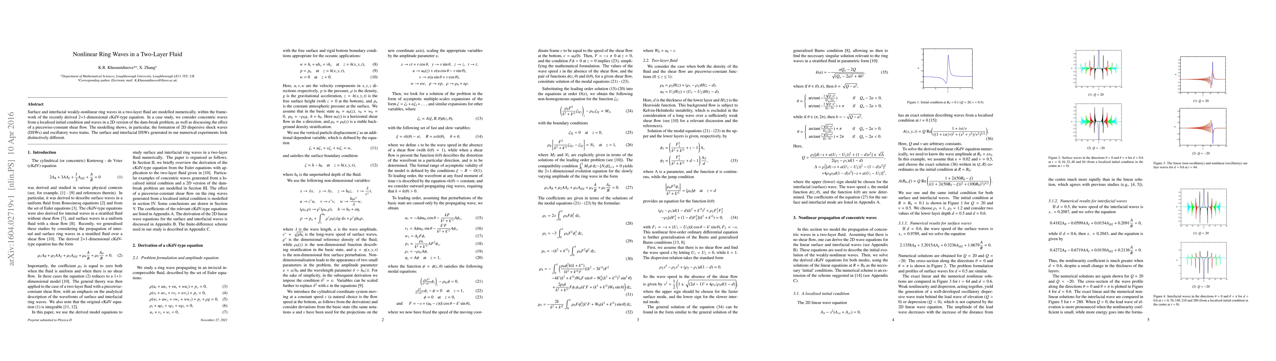 Researchers model nonlinear ring waves in a two-layer fluid using a new equation, finding distinct 2D dispersive shock waves and oscillatory wave trains that form under specific conditions.