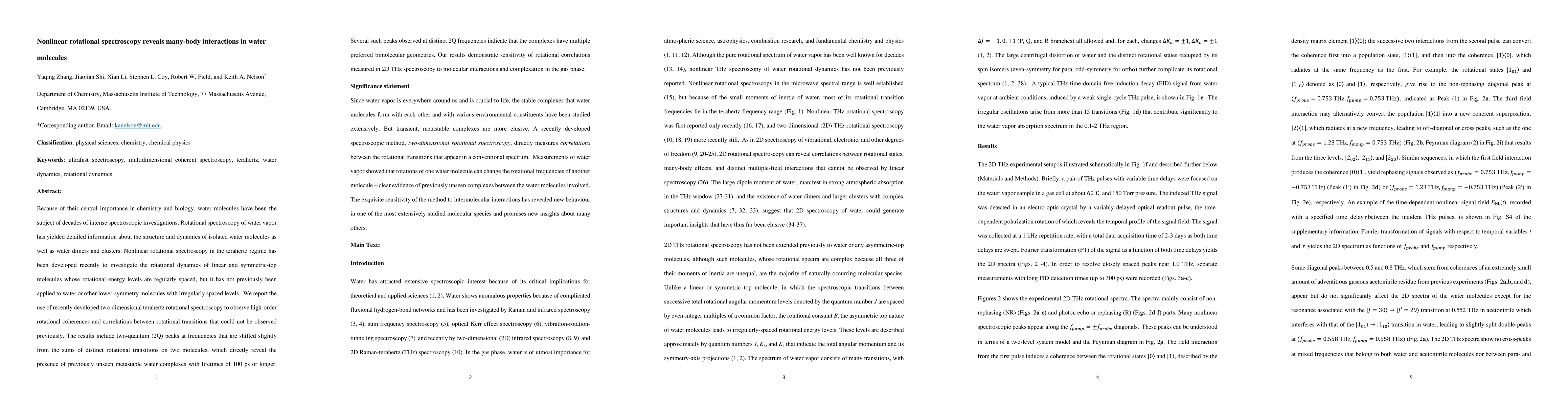 This paper utilizes nonlinear rotational spectroscopy in the terahertz regime to reveal many-body interactions in water molecules, discovering previously unseen metastable water complexes through high-order rotational coherences and correlations. The findings indicate multiple preferred geometries for these complexes, showcasing the technique's sensitivity to molecular interactions in gas phase.
