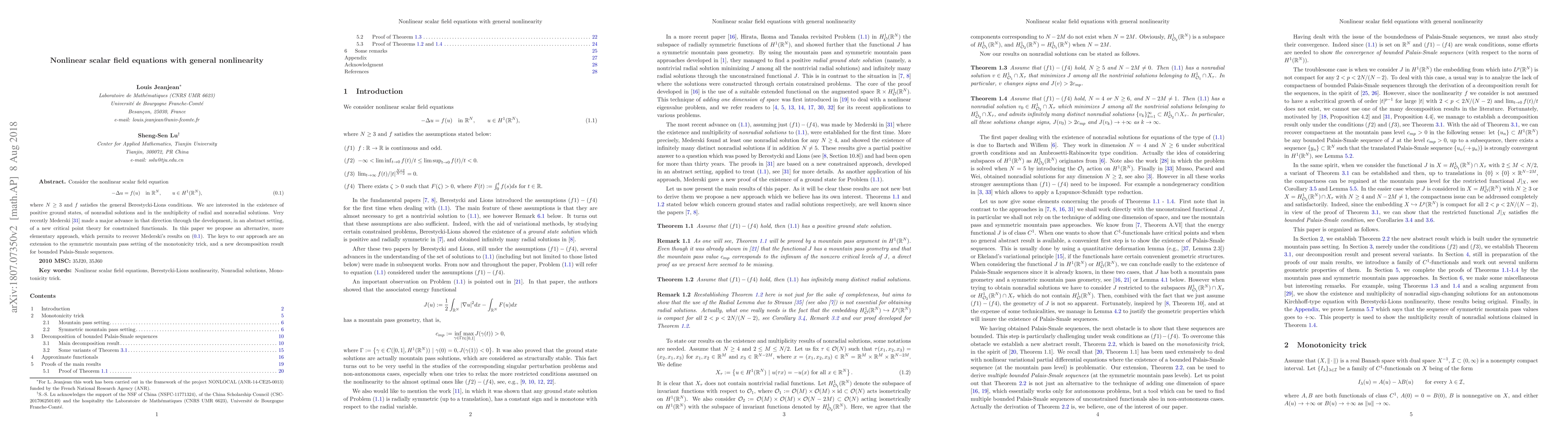 The paper investigates the existence of positive ground states and nonradial solutions to a nonlinear scalar field equation with general nonlinearity, developing an alternative approach to recent critical point theory for constrained functionals.