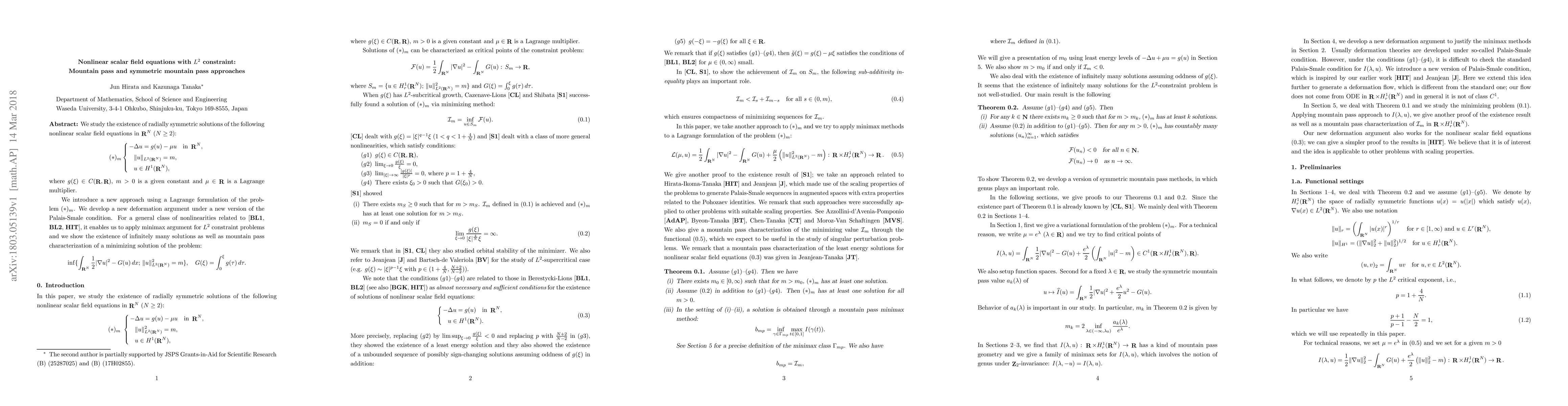 The paper studies nonlinear scalar field equations with an L^2 constraint, showing existence of infinitely many solutions and a mountain pass characterization of minimizing solutions.