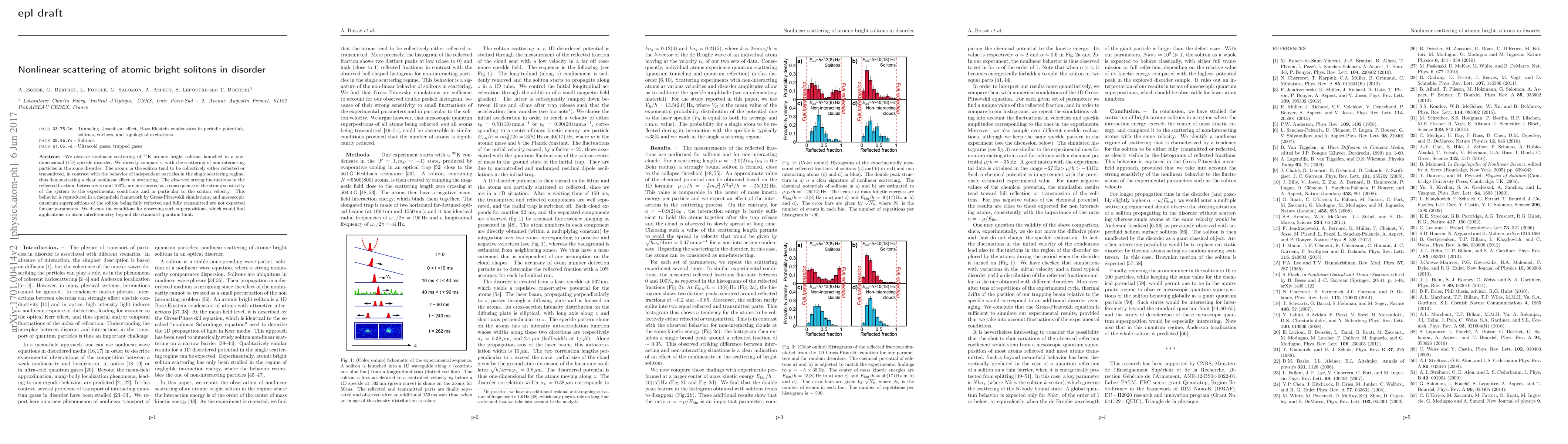 We observe nonlinear scattering of 39 K atomic bright solitons launched in a one-dimensional (1D) speckle disorder. We directly compare it with the scattering of non-interacting particles in the same disorder. The atoms in the soliton tend to be collectively either reflected or transmitted, in contrast with the behavior of independent particles, thus demonstrating a clear nonlinear effect in scattering. The observed strong fluctuations in the reflected fraction, between zero and 100%, are interpreted as a consequence of the strong sensitivity of the system to the experimental conditions and in particular to the soliton velocity. This behavior is reproduced in a mean-field framework by Gross-Pitaevskii simulations, and mesoscopic quantum superpositions of the soliton being fully reflected and fully transmitted are not expected for our parameters. We discuss the conditions for observing such superpositions, which would find applications in atom interferometry beyond the standard quantum limit.
