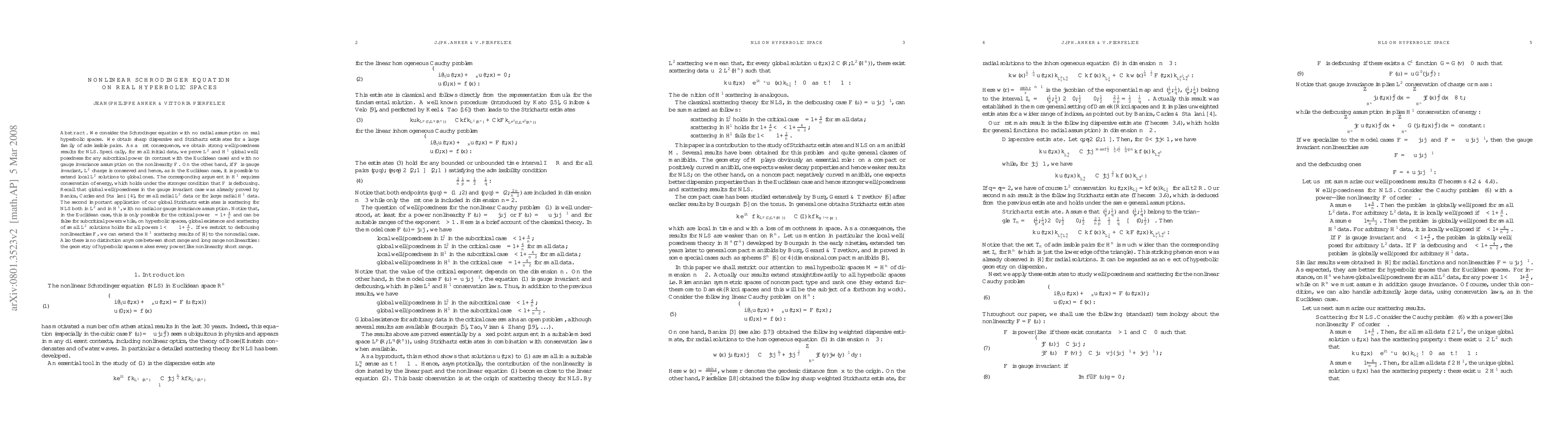 We consider the Schr\"odinger equation with no radial assumption on real hyperbolic spaces. We obtain sharp dispersive and Strichartz estimates for a large family of admissible pairs. As a first consequence, we get strong well-posedness results for NLS. Specifically, for small intial data, we prove $L^2$ and $H^1$ global well-posedness for any subcritical nonlinearity (in contrast with the Euclidean case) and with no gauge invariance assumption on the nonlinearity $F$. On the other hand, if $F$ is gauge invariant, $L^2$ charge is conserved and hence, as in the Euclidean case, it is possible to extend local $L^2$ solutions to global ones. The corresponding argument in $H^1$ requires the conservation of energy, which holds under the stronger condition that $F$ is defocusing. Recall that global well-posedness in the gauge invariant case was already proved by Banica, Carles & Staffilani, for small radial $L^2$ data and for large radial $H^1$ data. The second important application of our global Strichartz estimates is "scattering" for NLS both in $L^2$ and in $H^1$, with no radial or gauge invariance assumption. Notice that, in the Euclidean case, this is only possible for the critical power $\gamma=1+\frac4n$ and can be false for subcritical powers while, on hyperbolic spaces, global existence and scattering of small $L^2$ solutions holds for all powers $1<\gamma\le1+\frac4n$. If we restrict to defocusing nonlinearities $F$, we can extend the $H^1$ scattering results of Banica, Carles & Staffilani to the nonradial case. Also there is no distinction anymore between short range and long range nonlinearity : the geometry of hyperbolic spaces makes every power-like nonlinearity short range.