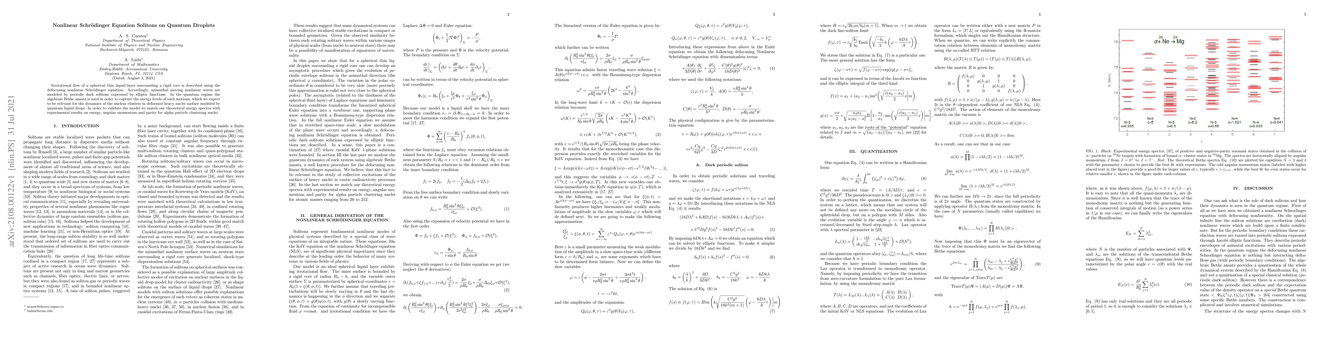 This paper models the irrotational flow of a liquid layer using the defocusing nonlinear Schrödinger equation, identifying periodic dark solitons as azimuthal moving nonlinear waves. It employs the algebraic Bethe ansatz to determine the energy levels relevant to nuclear clusters in deformed heavy nuclei, and validates the model by comparing theoretical spectra with experimental data on alpha particle clustering nuclei.