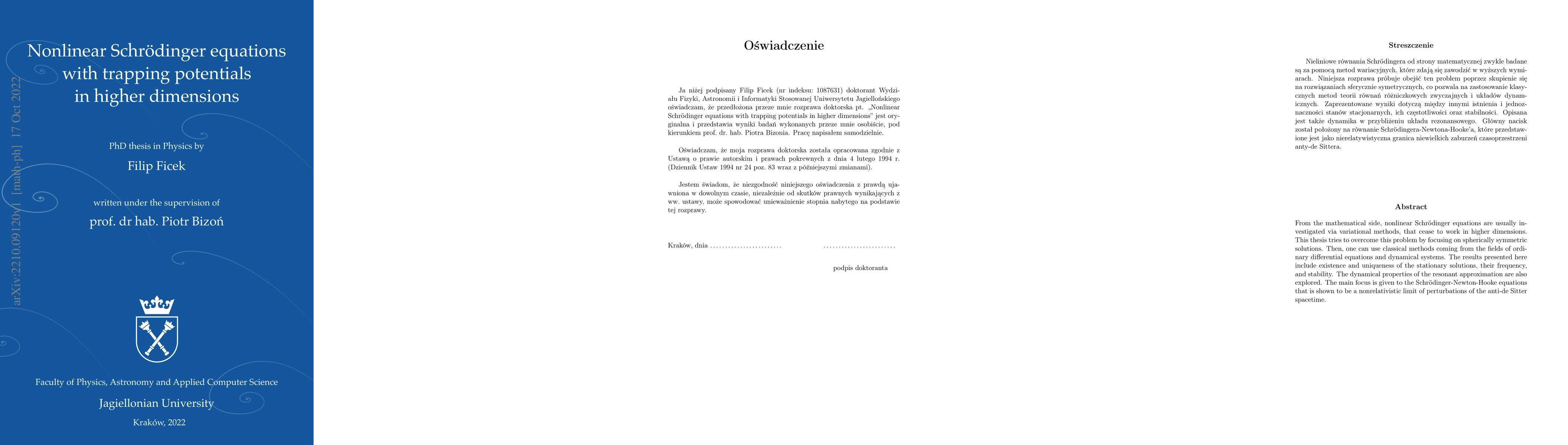 From the mathematical side, nonlinear Schr\"odinger equations are usually investigated via variational methods, that cease to work in higher dimensions. This thesis tries to overcome this problem by focusing on spherically symmetric solutions. Then, one can use classical methods coming from the fields of ordinary differential equations and dynamical systems. The results presented here include existence and uniqueness of the stationary solutions, their frequency, and stability. The dynamical properties of the resonant approximation are also explored. The main focus is given to the Schr\"odinger-Newton-Hooke equations that is shown to be a nonrelativistic limit of perturbations of the anti-de Sitter spacetime.
