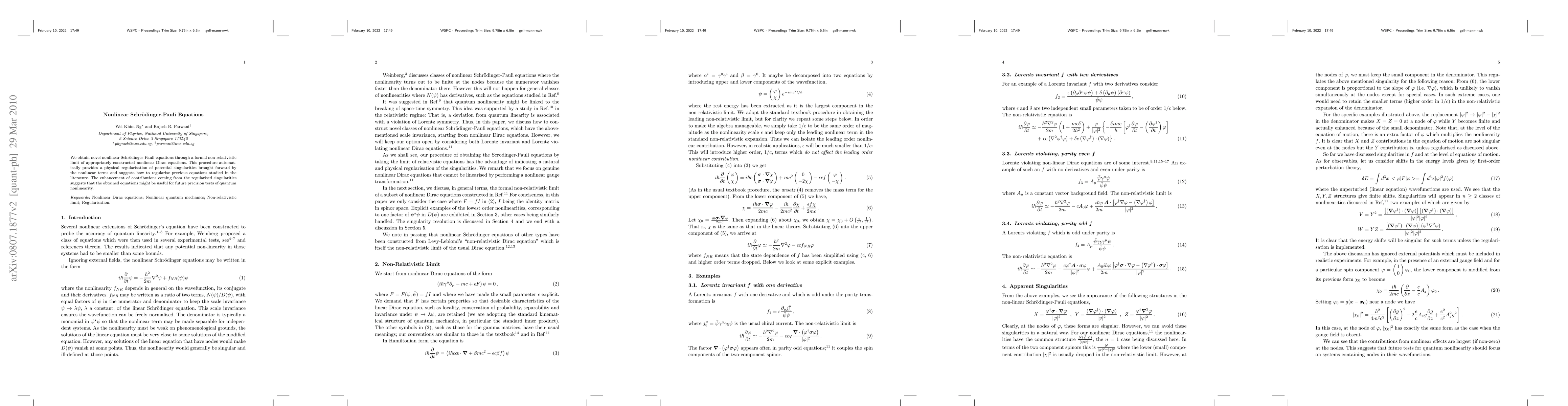 We obtain novel nonlinear Schr\"{o}dinger-Pauli equations through a formal non-relativistic limit of appropriately constructed nonlinear Dirac equations. This procedure automatically provides a physical regularisation of potential singularities brought forward by the nonlinear terms and suggests how to regularise previous equations studied in the literature. The enhancement of contributions coming from the regularised singularities suggests that the obtained equations might be useful for future precision tests of quantum nonlinearity.