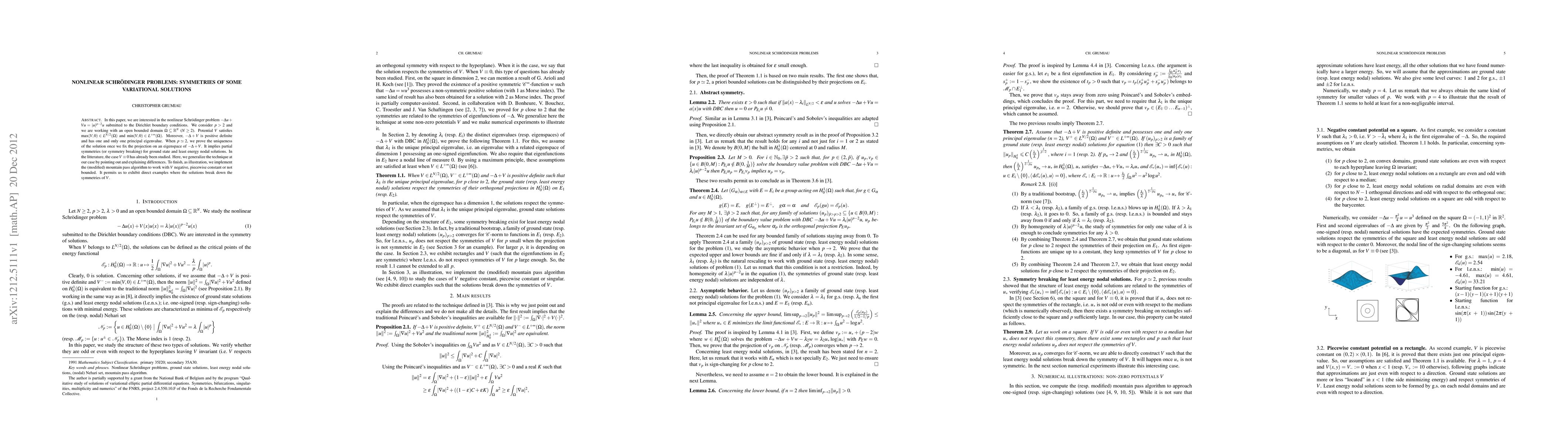 In this paper, we are interested in the nonlinear Schr\"odinger problem $-\Delta u + Vu = \abs{u}^{p-2}u$ submitted to the Dirichlet boundary conditions. We consider $p>2$ and we are working with an open bounded domain $\Omega\subset\IR^N$ ($N\geq 2$). Potential $V$ satisfies $\max(V,0)\in L^{N/2}(\Omega)$ and $\min(V,0)\in L^{+\infty}(\Omega)$. Moreover, $-\Delta + V$ is positive definite and has one and only one principal eigenvalue. When $p\simeq 2$, we prove the uniqueness of the solution once we fix the projection on an eigenspace of $-\Delta + V$. It implies partial symmetries (or symmetry breaking) for ground state and least energy nodal solutions. In the litterature, the case $V\equiv 0$ has already been studied. Here, we generalize the technique at our case by pointing out and explaining differences. To finish, as illustration, we implement the (modified) mountain pass algorithm to work with $V$ negative, piecewise constant or not bounded. It permits us to exhibit direct examples where the solutions break down the symmetries of $V$.