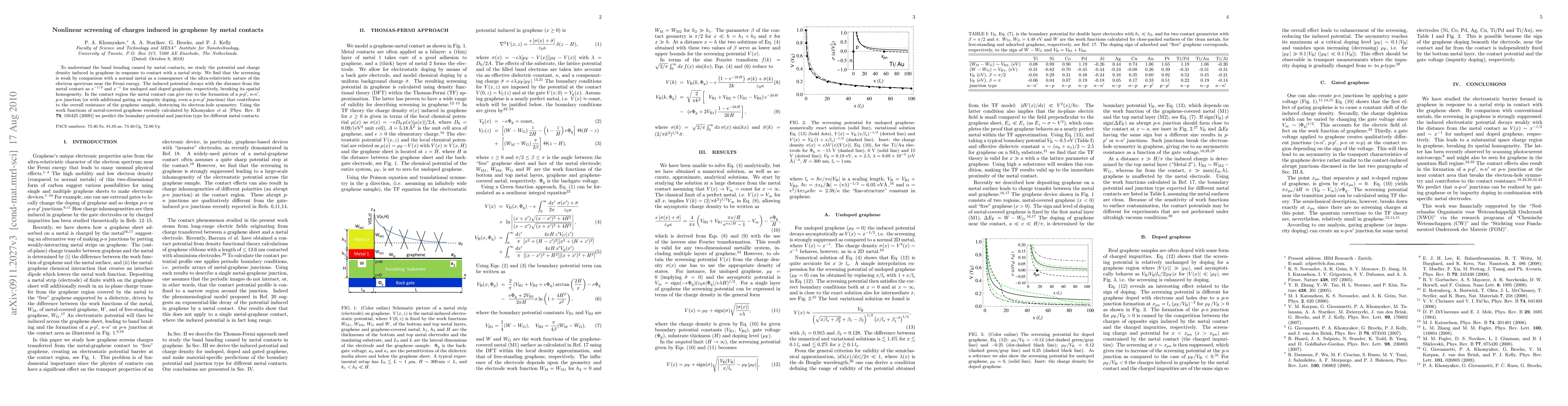 This paper investigates the nonlinear screening of charges in graphene due to metal contacts, revealing weak screening compared to normal metals due to the ultra-relativistic electron spectrum near the Fermi level. The induced potential decays non-uniformly, forming various junctions that disrupt graphene's electron-hole symmetry.