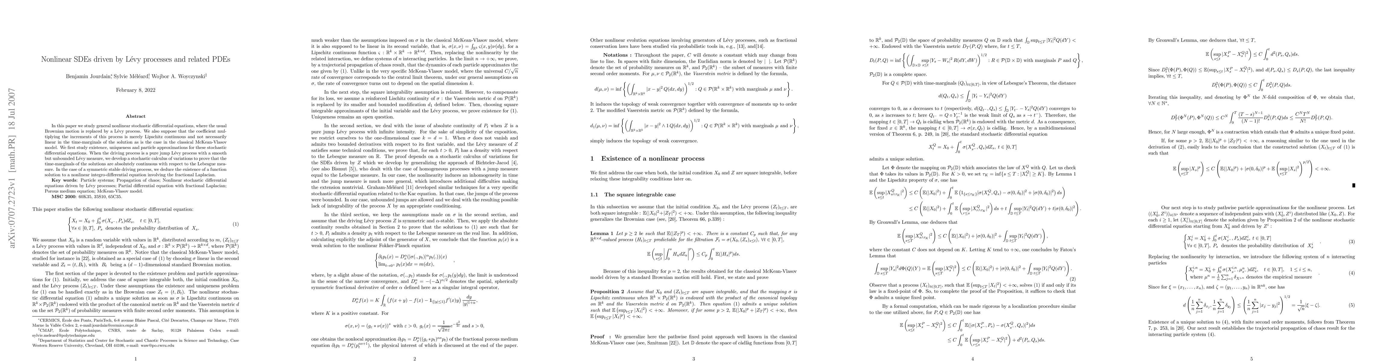 This paper investigates nonlinear stochastic differential equations driven by Lévy processes, focusing on existence, uniqueness, and particle approximations. It develops a stochastic calculus for pure jump Lévy processes to show solution continuity and deduces a nonlinear integro-differential equation for symmetric stable processes involving the fractional Laplacian.