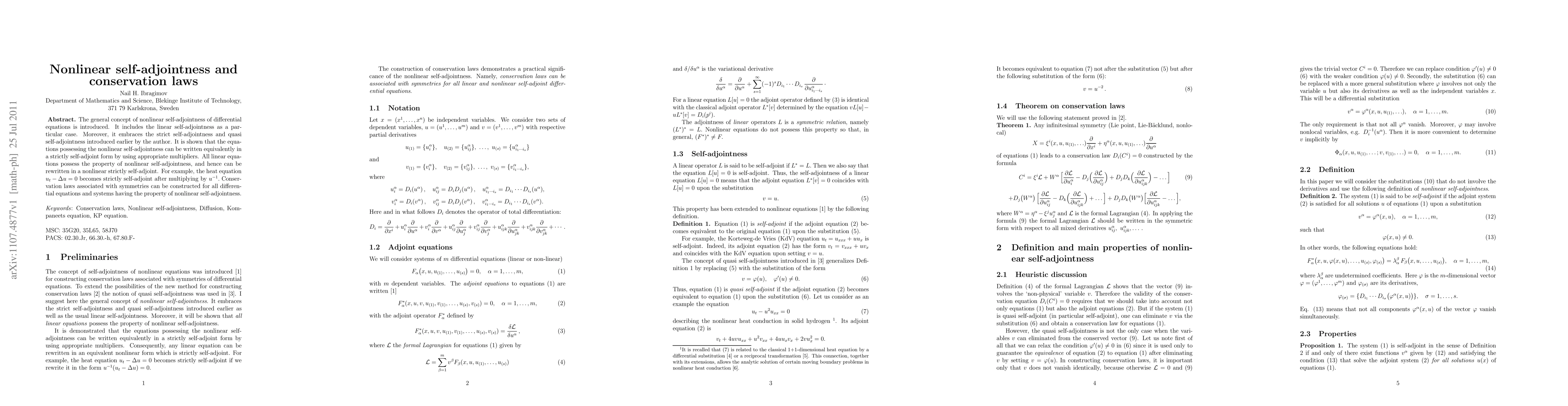 This paper introduces the concept of nonlinear self-adjointness for differential equations, encompassing linear, strict, and quasi self-adjointness. It demonstrates that nonlinear self-adjoint equations can be reformulated in strictly self-adjoint form, and conservation laws can be derived for such systems.