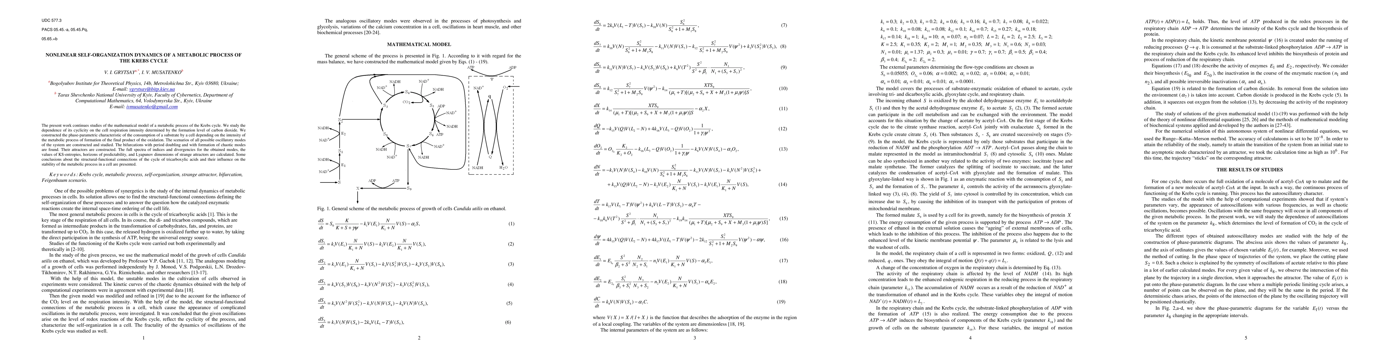 This research investigates the nonlinear dynamics of the Krebs cycle's metabolic process, focusing on its cyclicity relative to cell respiration intensity. The study identifies bifurcations, chaotic modes, and strange attractors, and calculates KS-entropies, predictability horizons, and Lyapunov dimensions, concluding on the cycle's structural-functional impacts on metabolic stability.