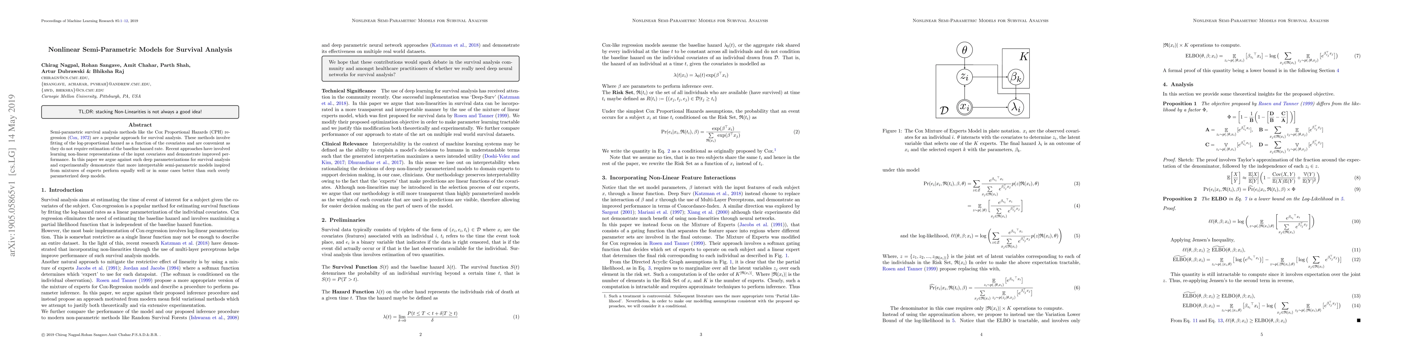 Semi-parametric survival analysis methods like the Cox Proportional Hazards (CPH) regression (Cox, 1972) are a popular approach for survival analysis. These methods involve fitting of the log-proportional hazard as a function of the covariates and are convenient as they do not require estimation of the baseline hazard rate. Recent approaches have involved learning non-linear representations of the input covariates and demonstrate improved performance. In this paper we argue against such deep parameterizations for survival analysis and experimentally demonstrate that more interpretable semi-parametric models inspired from mixtures of experts perform equally well or in some cases better than such overly parameterized deep models.