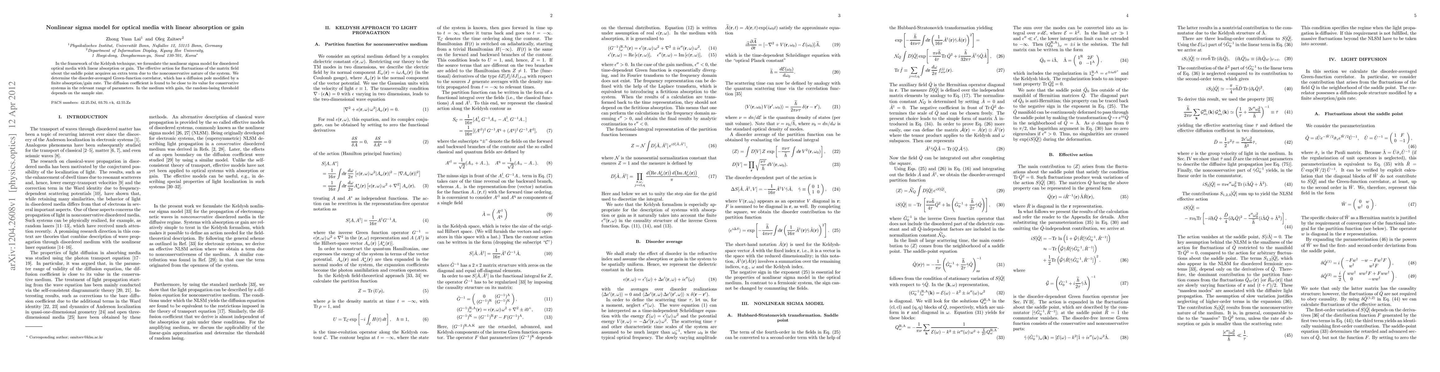 This paper formulates a nonlinear sigma model for disordered optical media with linear absorption or gain using the Keldysh technique, revealing an extra term in the effective action due to the system's nonconservative nature. The study finds that the diffusion coefficient remains similar to conservative systems, and in media with gain, the random-lasing threshold varies with sample size.