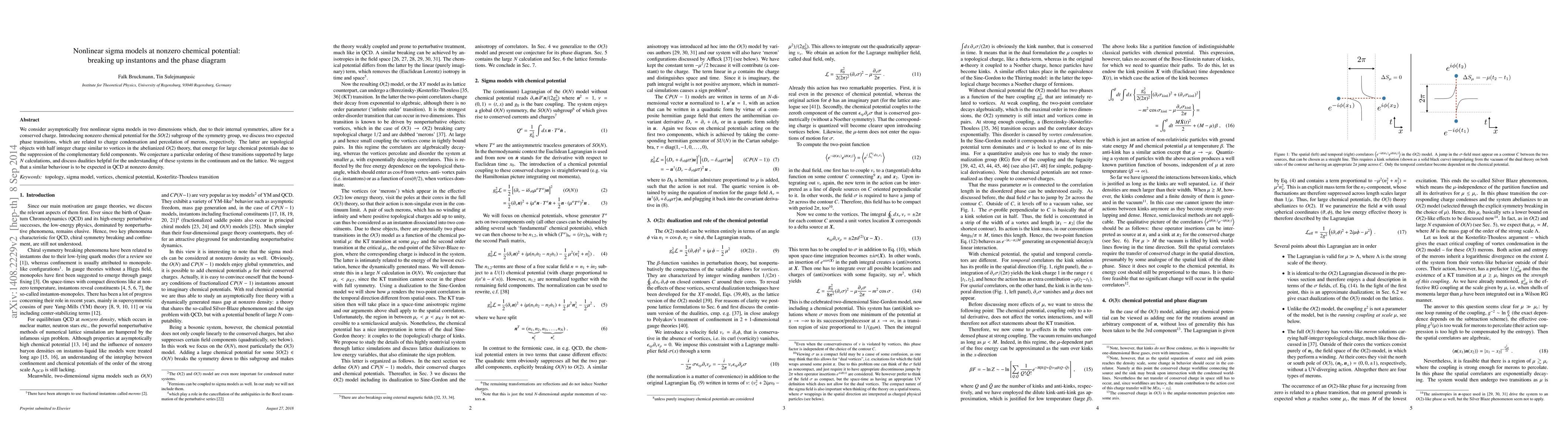 We consider asymptotically free nonlinear sigma models in two dimensions which, due to their internal symmetries, allow for a conserved charge. Introducing nonzero chemical potential for the SO(2) subgroup of the symmetry group, we discuss two expected phase transitions, which are related to charge condensation and percolation of merons, respectively. The latter are topological objects with half integer charge similar to vortices in the abelianized \emph{O(2)} theory, that emerge for large chemical potentials due to the suppression of the complementary field components. We conjecture a particular ordering of these transitions supported by large N calculations, and discuss dualities helpful for the understanding of these systems in the continuum and on the lattice. In conclusion we suggest that similar behavior is to be expected in QCD at finite density.