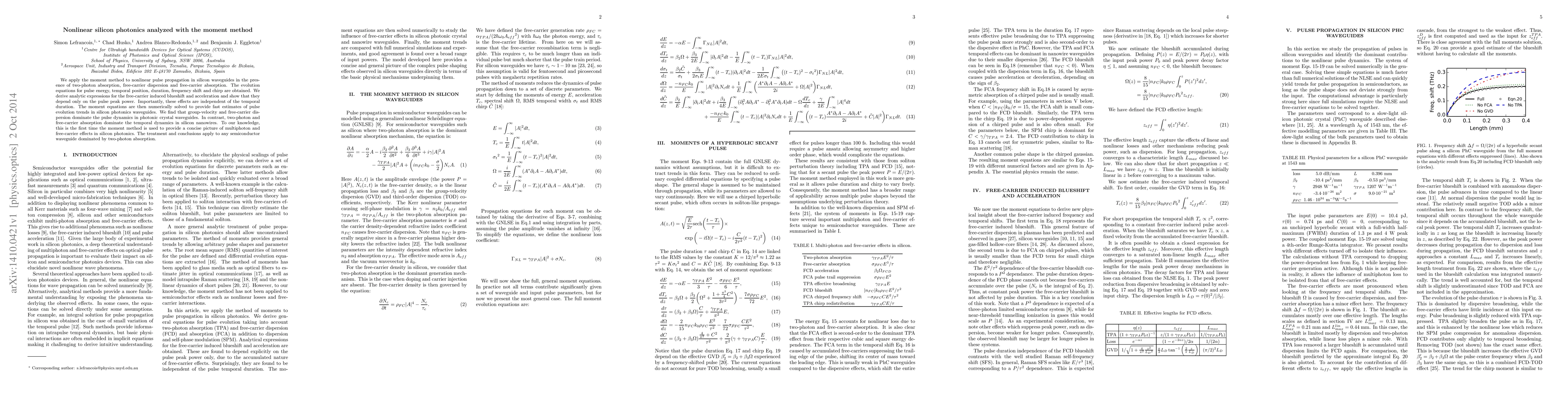 This paper applies the moment method to analyze nonlinear pulse propagation in silicon photonics, focusing on effects like two-photon absorption and free-carrier dispersion. It provides analytic expressions for pulse dynamics and shows that group-velocity and free-carrier dispersion dominate in photonic crystal waveguides, while two-photon and free-carrier absorption are more significant in silicon nanowires.