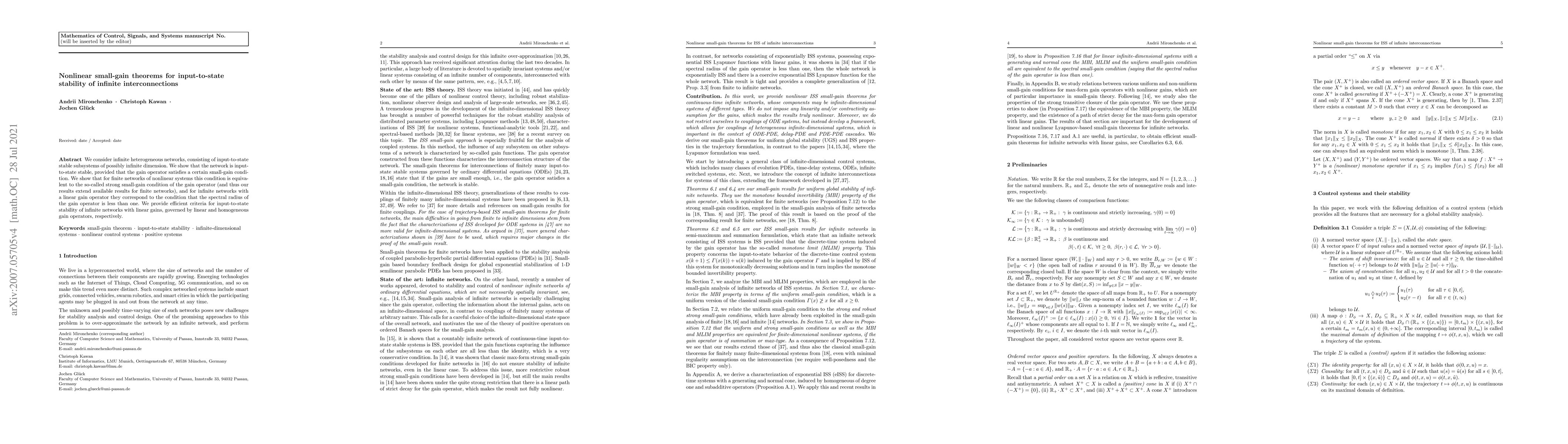 We consider infinite heterogeneous networks, consisting of input-to-state stable subsystems of possibly infinite dimension. We show that the network is input-to-state stable, provided that the gain operator satisfies a certain small-gain condition. We show that for finite networks of nonlinear systems this condition is equivalent to the so-called strong small-gain condition of the gain operator (and thus our results extend available results for finite networks), and for infinite networks with a linear gain operator they correspond to the condition that the spectral radius of the gain operator is less than one. We provide efficient criteria for input-to-state stability of infinite networks with linear gains, governed by linear and homogeneous gain operators, respectively.