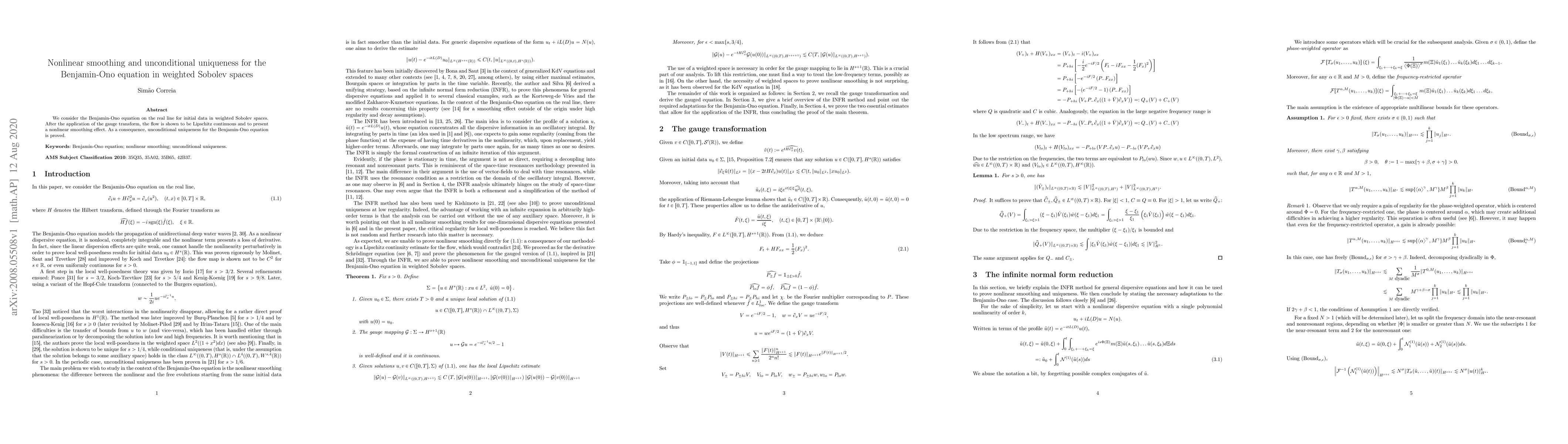 This paper investigates the Benjamin-Ono equation in weighted Sobolev spaces, demonstrating Lipschitz continuity and nonlinear smoothing through gauge transform, leading to unconditional uniqueness.