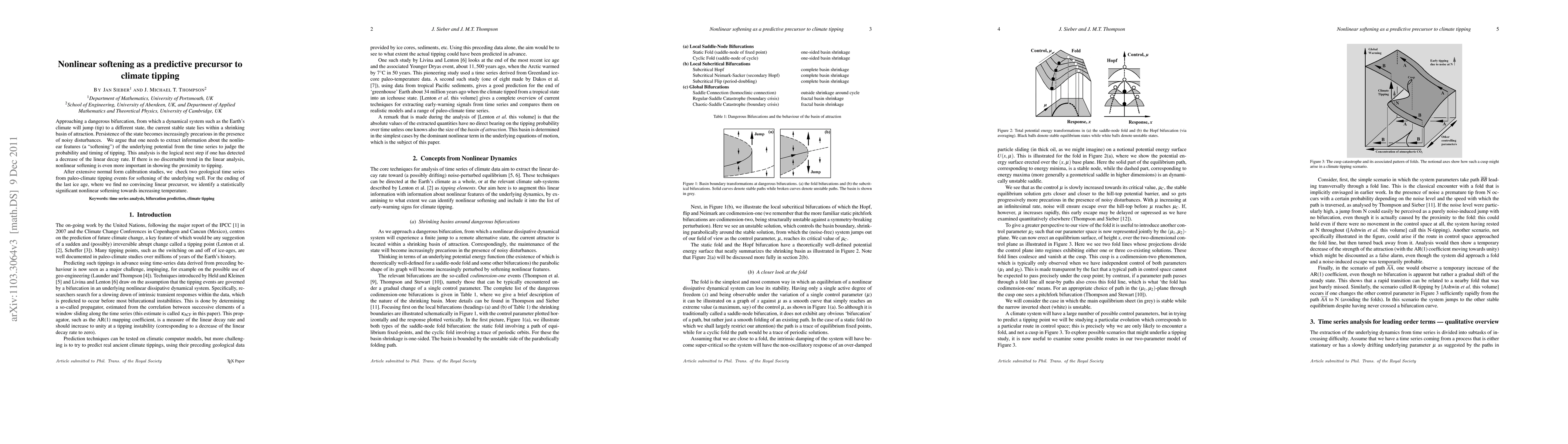 Approaching a dangerous bifurcation, from which a dynamical system such as the Earth's climate will jump (tip) to a different state, the current stable state lies within a shrinking basin of attraction. Persistence of the state becomes increasingly precarious in the presence of noisy disturbances. We consider an underlying potential, as defined theoretically for a saddle-node fold and (via averaging) for a Hopf bifurcation. Close to a stable state, this potential has a parabolic form; but approaching a jump it becomes increasingly dominated by softening nonlinearities. If we have already detected a decrease in the linear decay rate, nonlinear information allows us to estimate the propensity for early tipping due to noise. We argue that one needs to extract information about the nonlinear features (a "softening") of the underlying potential from the time series to judge the probability and timing of tipping. This analysis is the logical next step if one has detected a decrease of the linear decay rate. If there is no discernable trend in the linear analysis, nonlinear softening is even more important in showing the proximity to tipping. After extensive normal form calibration studies, we check two geological time series from paleo-climate tipping events for softening of the underlying well. For the ending of the last ice age, where we find no convincing linear precursor, we identify a statistically significant nonlinear softening towards increasing temperature. The analysis has thus successfully detected a warning of the imminent tipping event.